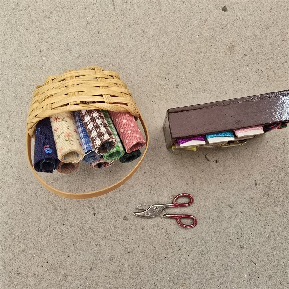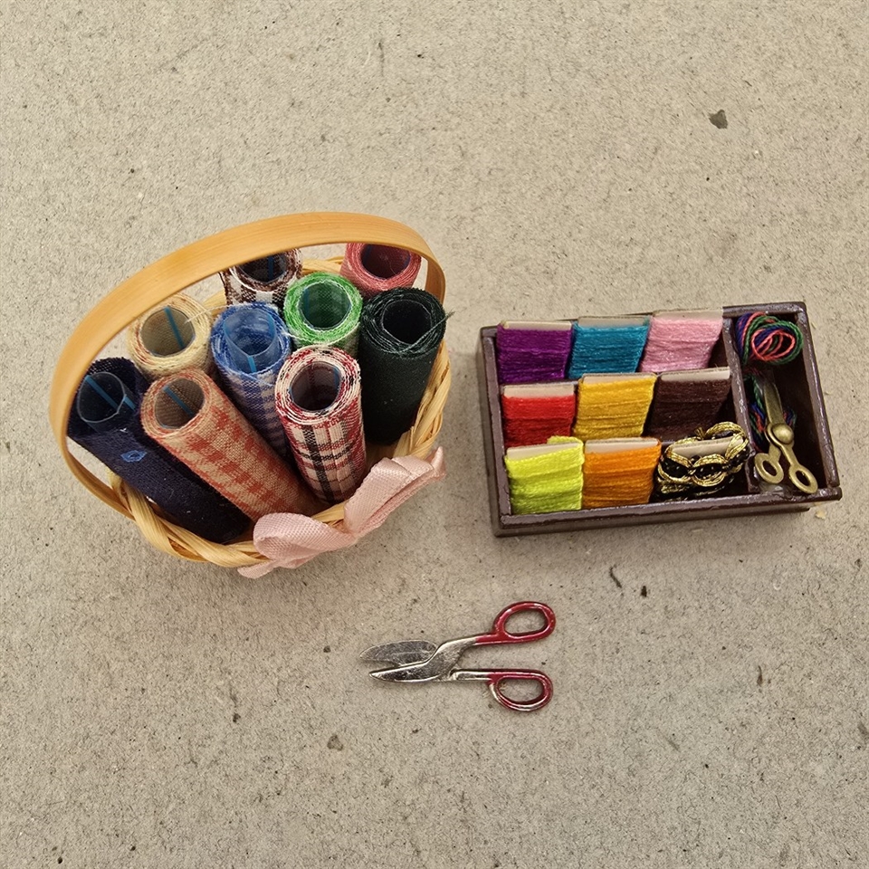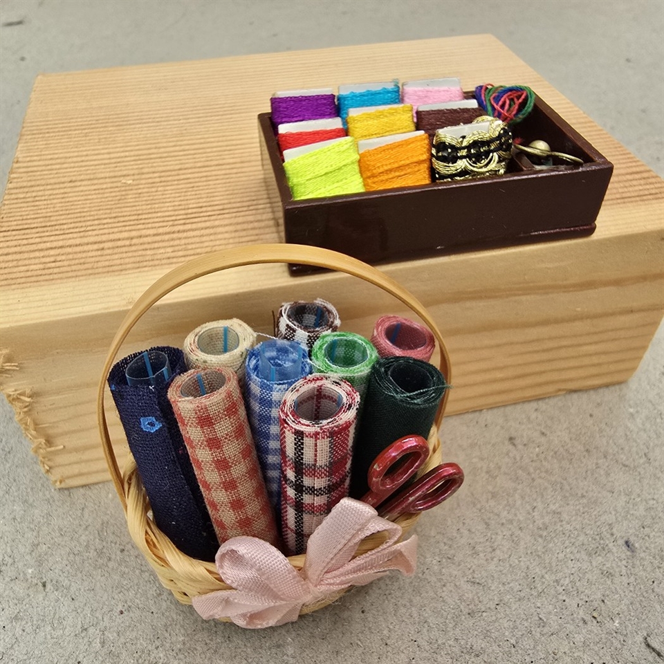 Opdag den charmerende verden af miniaturer med vores "Stofruller i kurv og kasse med garn og saks til dukkehuset"!