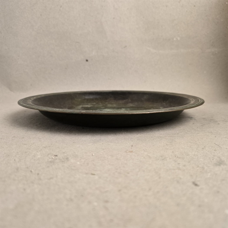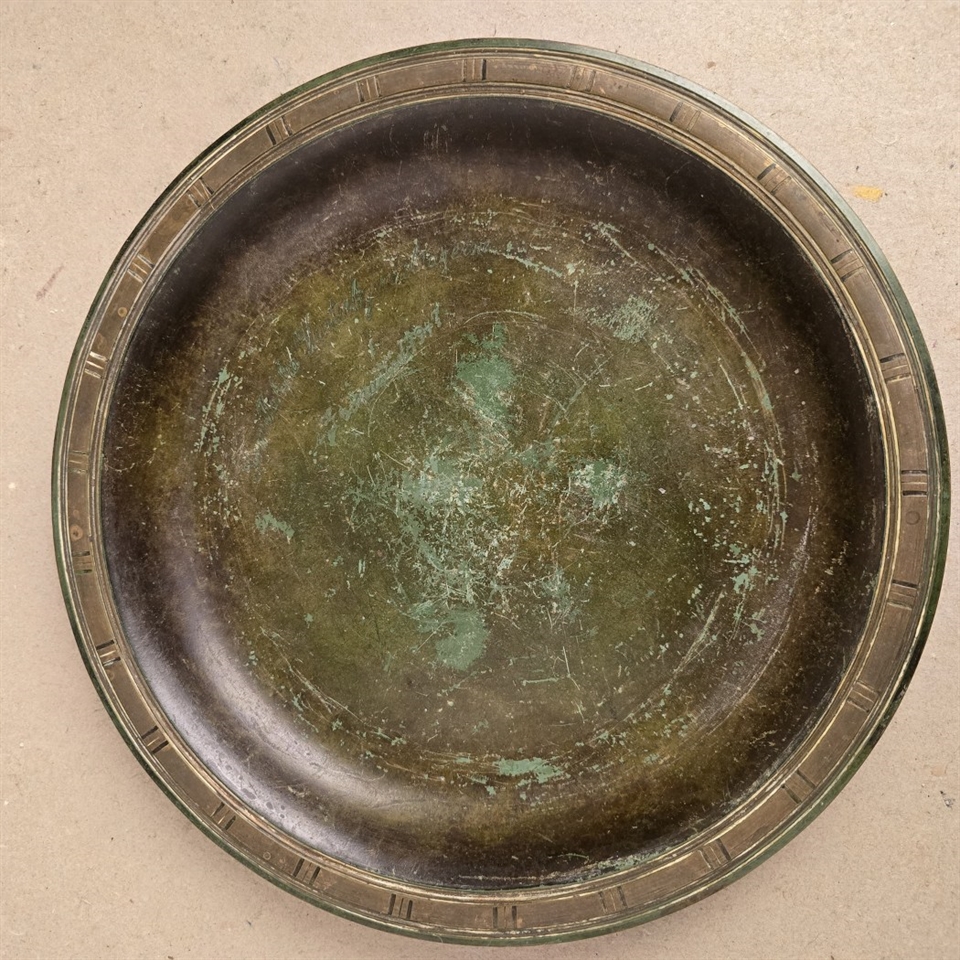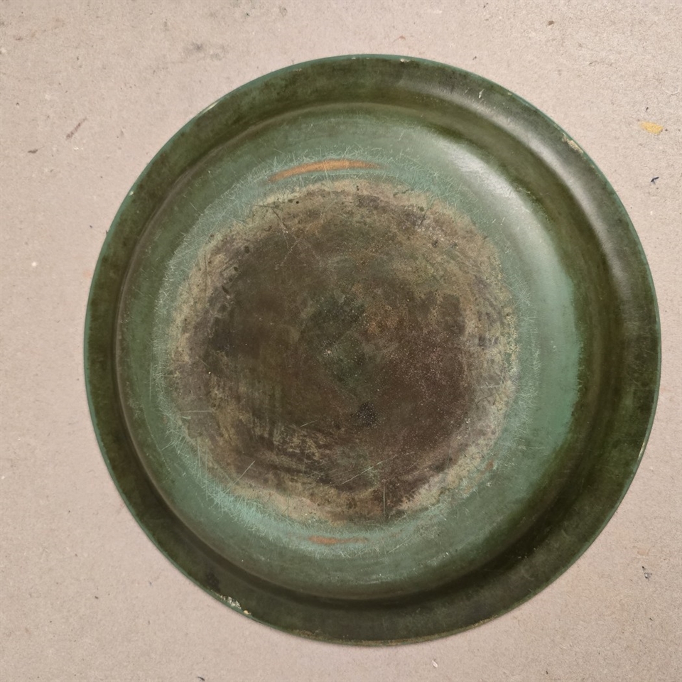 Dette unikke, runde serveringsfad er fremstillet i høj kvalitet bronze med en smuk, grøn patinering, der tilføjer et strejf af antik elegance til ethvert rum eller anledning.