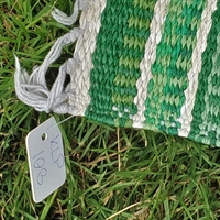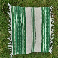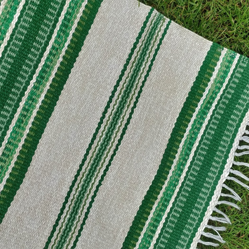 Denne svenske måtte er fremstillet af plastikstrimler og designet med attraktive grønne og hvide striber, der tilfører et frisk pust til enhver indretning.
