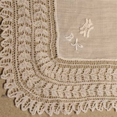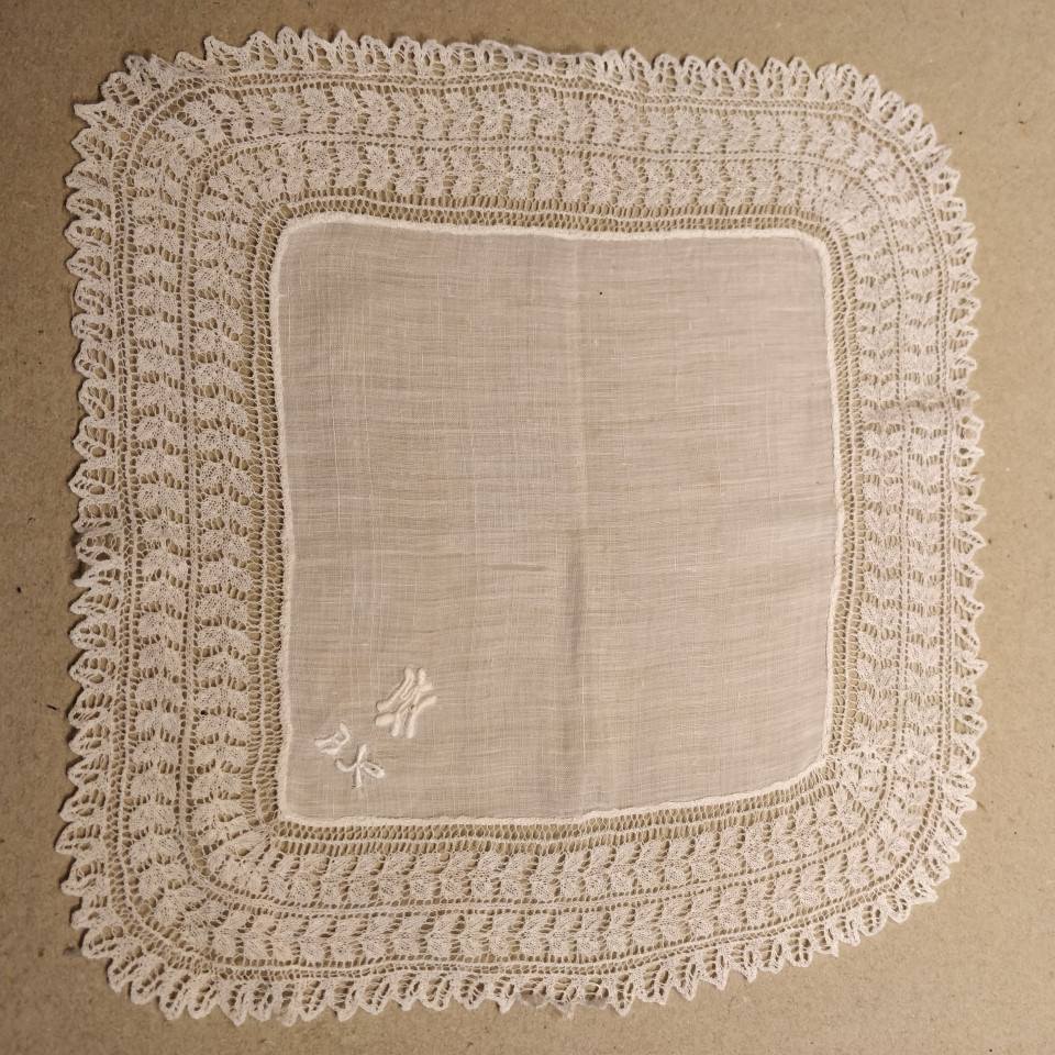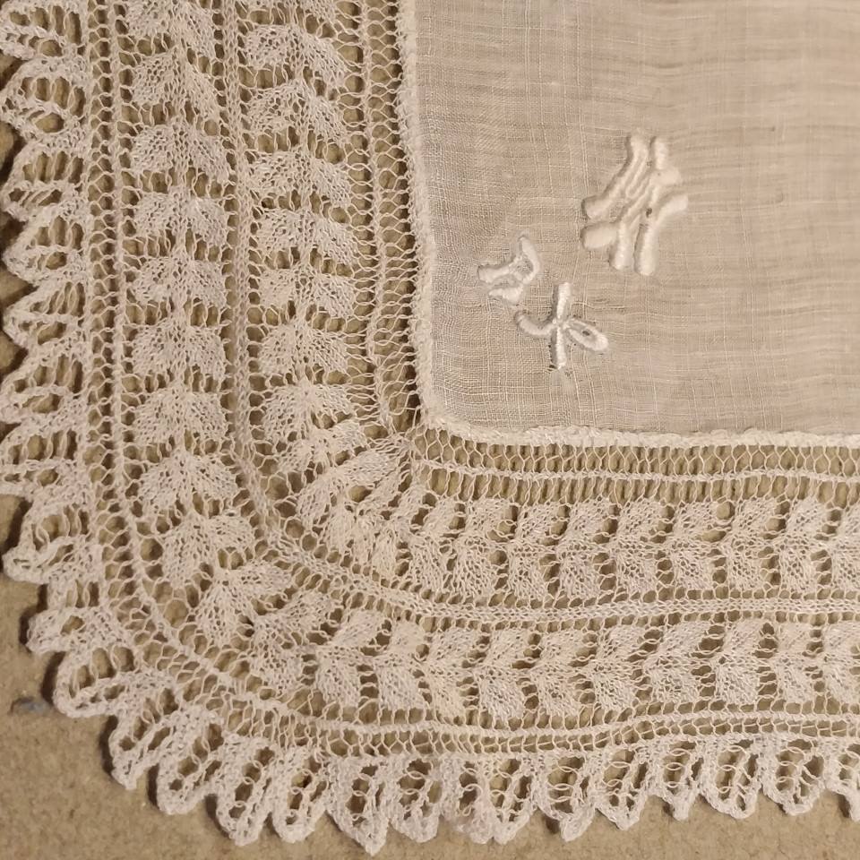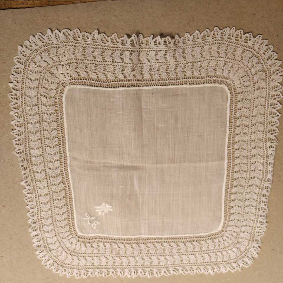 Fint gammelt lommetørklæde med monogram og strikket blondekant.