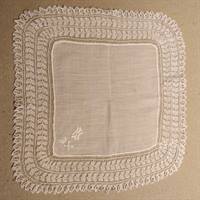 Strikket blondekant på lommetørklæde, hvidt bomuld.
