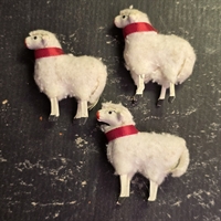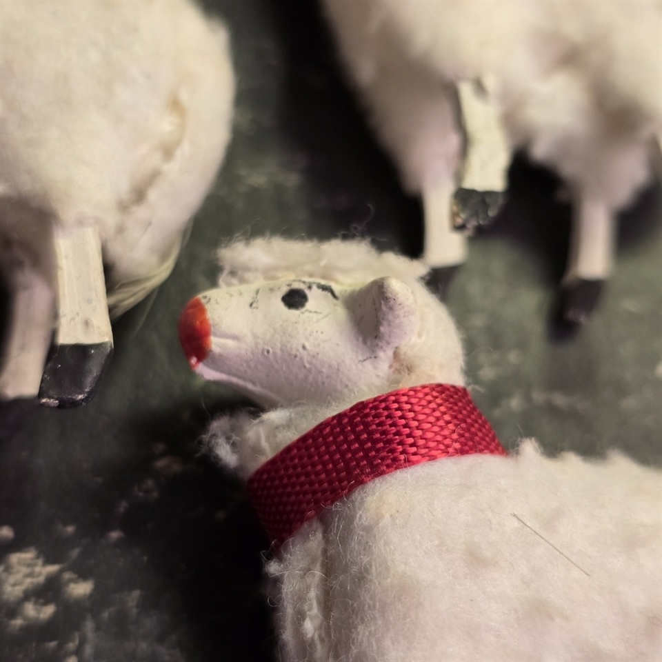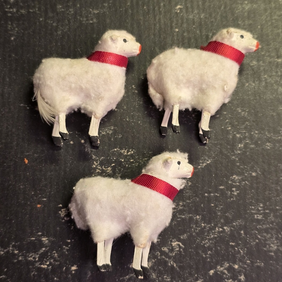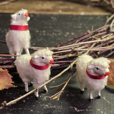Disse bedårende får er præcist 5,5 cm. høje og håndlavet med en fin hvid uld, der giver dem et livagtigt og indbydende udseende. Hvert får har et iøjnefaldende rødt bånd om halsen, som tilføjer en farverig kontrast til den bløde hvide uld.