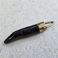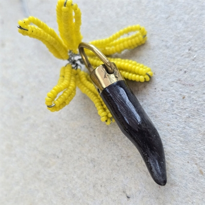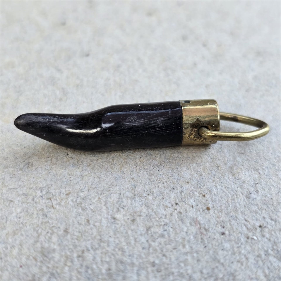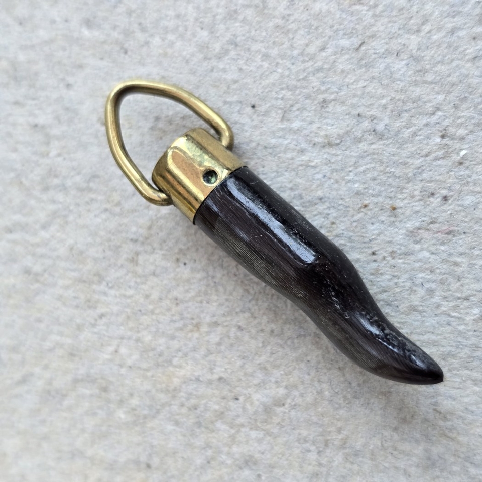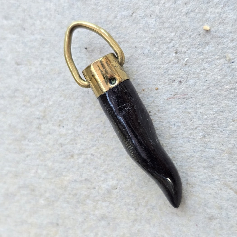 Med en længde på 3,4 cm., er dette tandlignende vedhæng omhyggeligt udskåret fra ægte horn og prydet med et øje af messing, hvilket giver det et tidløst look.