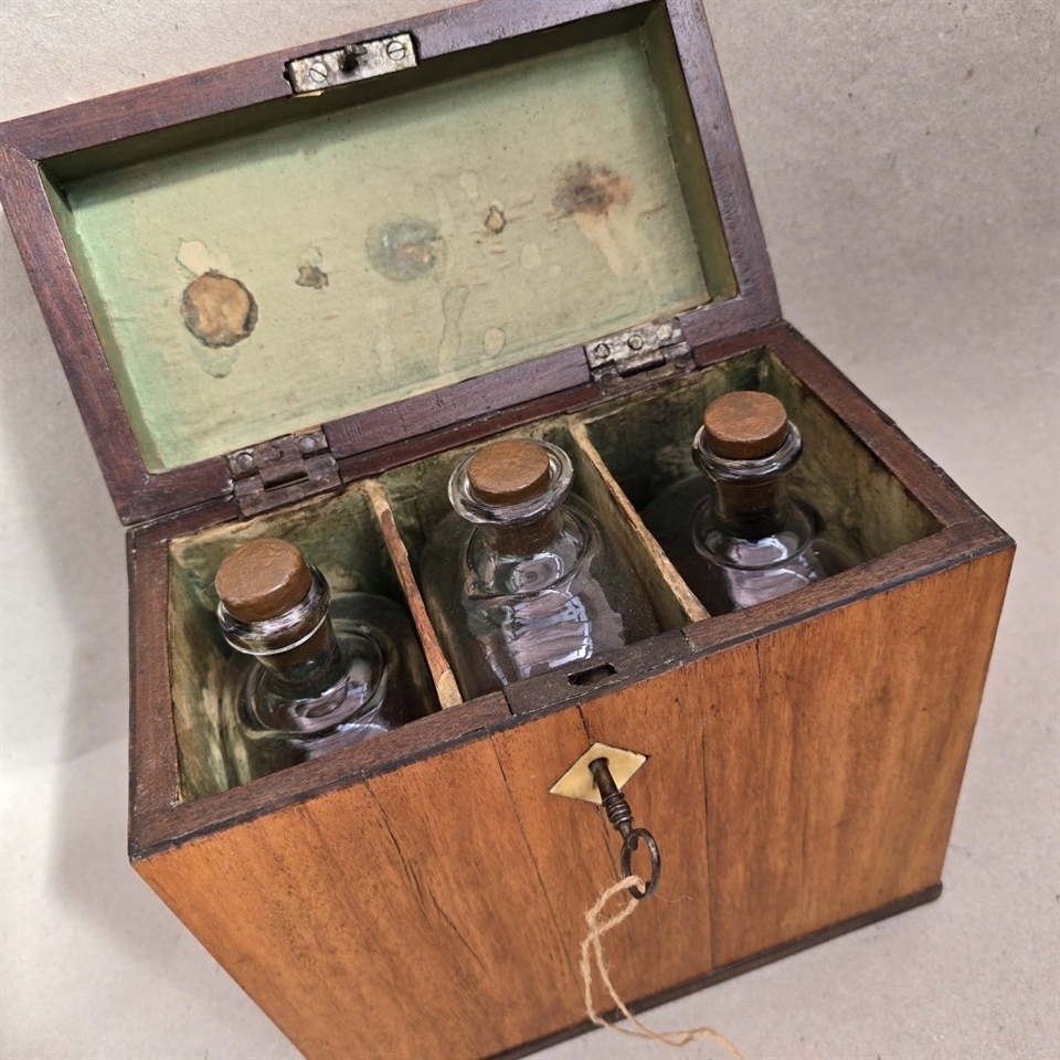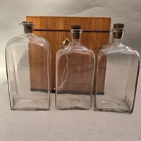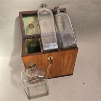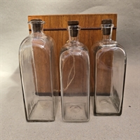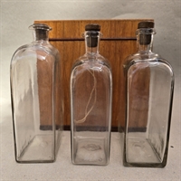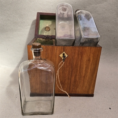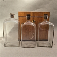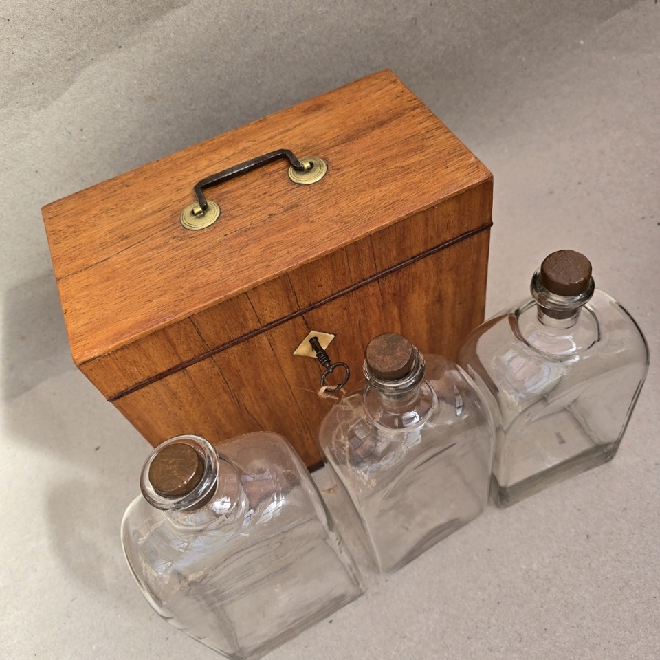 Opdag den ypperste elegance og eksklusivitet med "Tantalus, 3 gamle flasker i trææske med lås." Dette er ikke blot en tilfældighed af opbevaring, men et sandt mesterværk af dekorativ kunst og funktionalitet. Med dette luksuriøse sæt får du tre ældgamle, rektangulære flasker, hver forseglet med en klassisk korkprop, der lover at bevare dine ædle drikkevarer med uovertruffen stil.