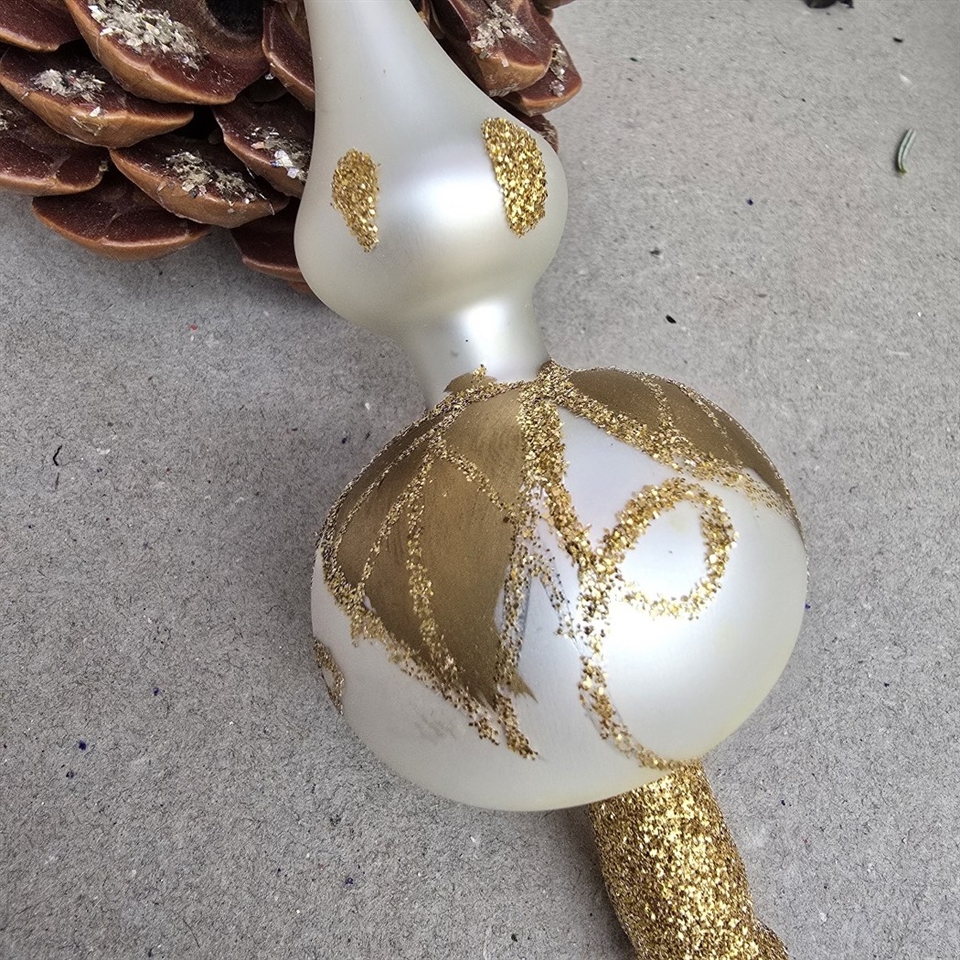 Topsiret er udført i mat hvidt glas og detaljeret med fine guld dekorationer, der glimter smukt, når lysene på juletræet fanger dem.
