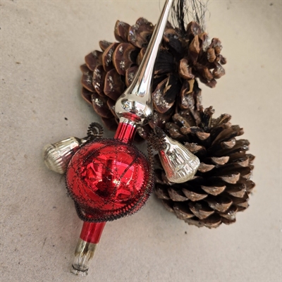 Dette smukke topspir er omhyggeligt håndlavet og udsmykket med rødt og sølvfarvet glas, der glimter smukt i julens lys. Omkring spiret er der snoet glitrende tinsel, og små sølvklokker dingler charmerende og tilføjer en finurlig, klingende lyd til din julefest.