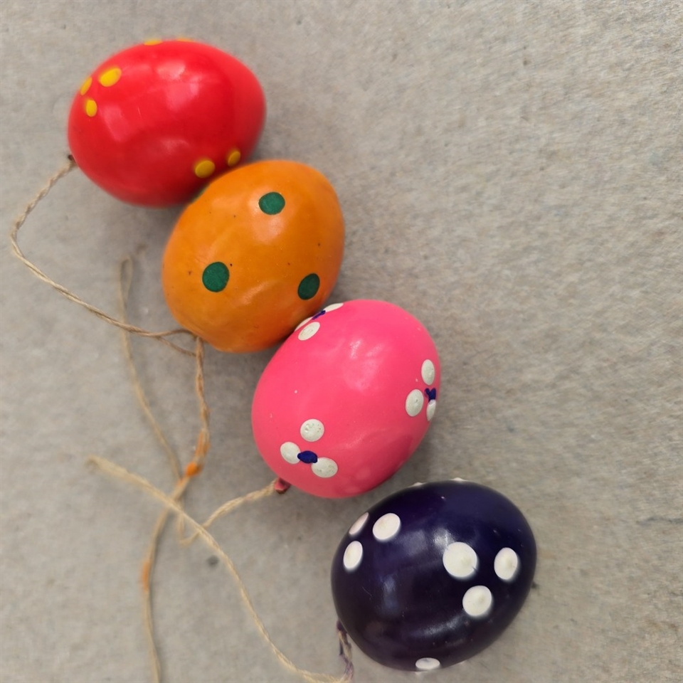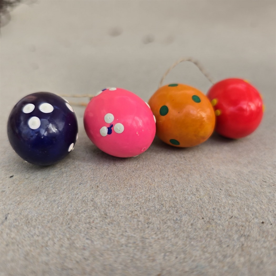 Hver æg måler 3 cm. i længden og er dekoreret med livlige, stærke farver og dekorative hvide prikker, der tilføjer et legende og festligt touch til enhver påskegren.