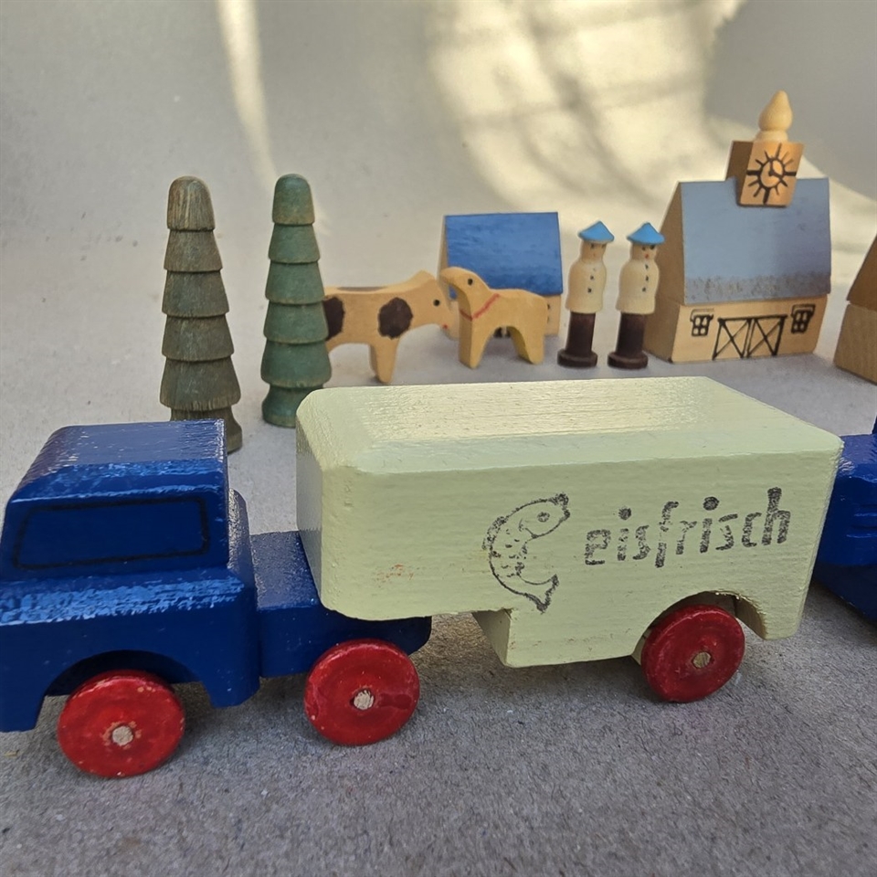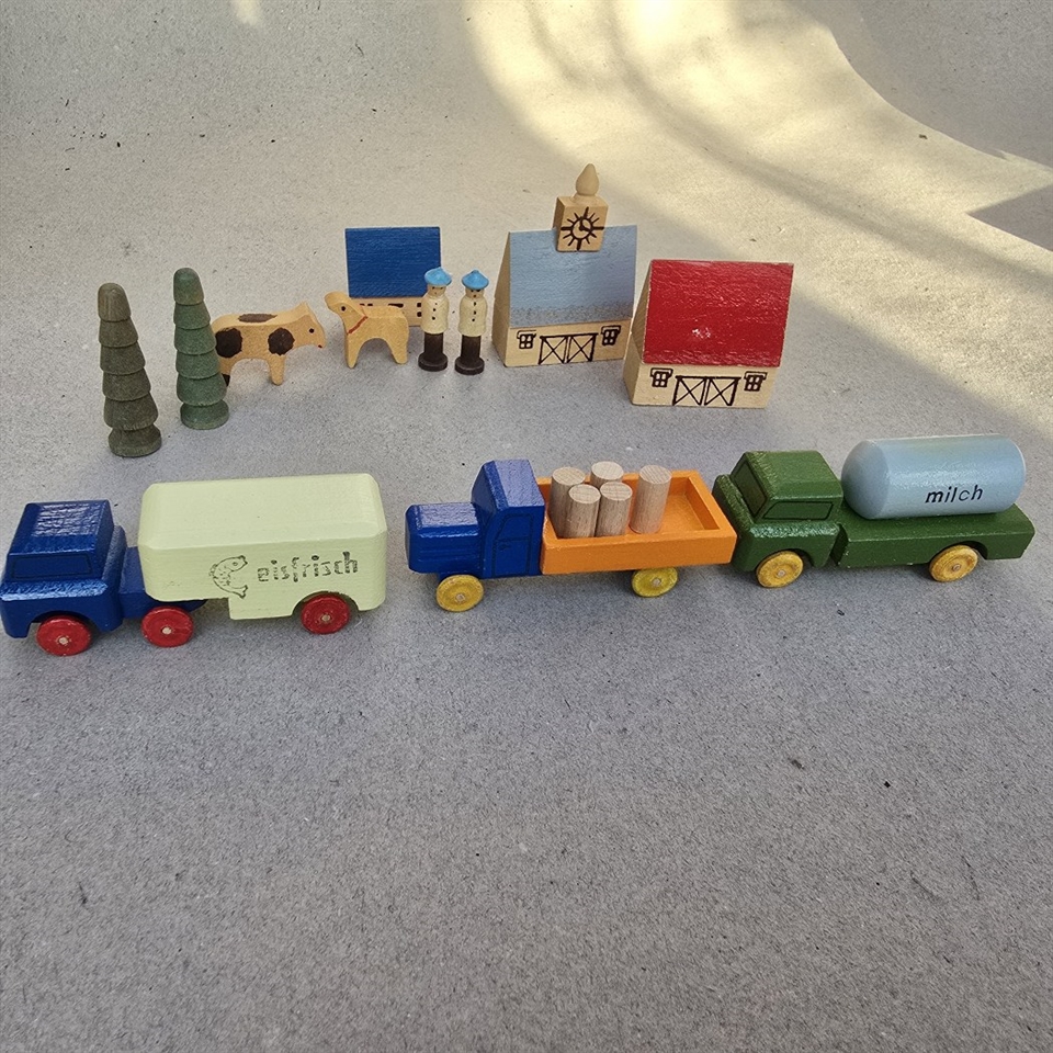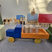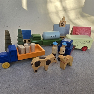 Farverig samling legetøj. Træhuse, søde dyr og robuste lastbiler