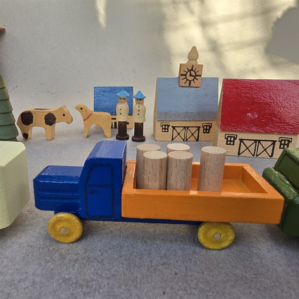 Opdag magien ved bæredygtig leg med vores charmerende "Træ Legetøjsby med Lastbiler, Dyr og Huse. Genbrug."
