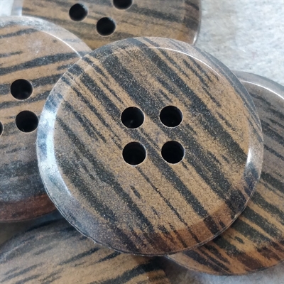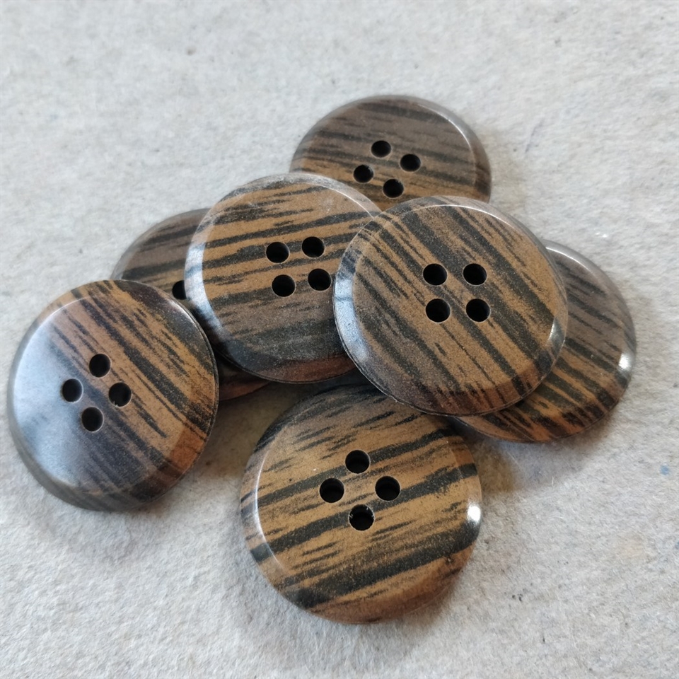 Disse knapper er fremstillet i Tyskland og udformet med en overbevisende brun-sort træfinish, hvilket gør dem til et ideelt valg for enhver, der værdsætter det klassiske trælook, men ønsker et mere holdbart materiale.