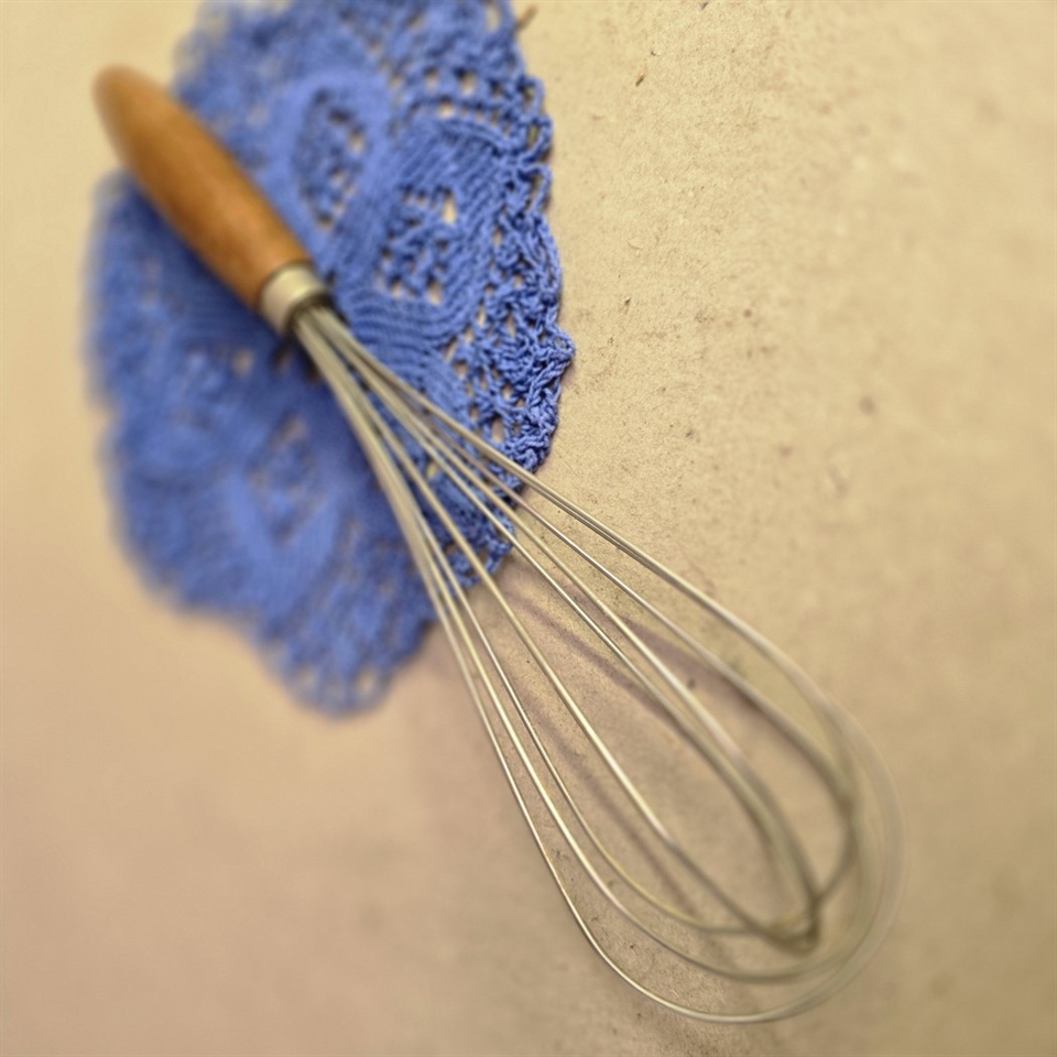 Opdag charmen fra fortiden med vores 'Træhåndtag på retro metal piskeris, gammelt køkkengrej' – det ideelle tilskud til ethvert køkken med sans for stil og tradition.