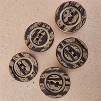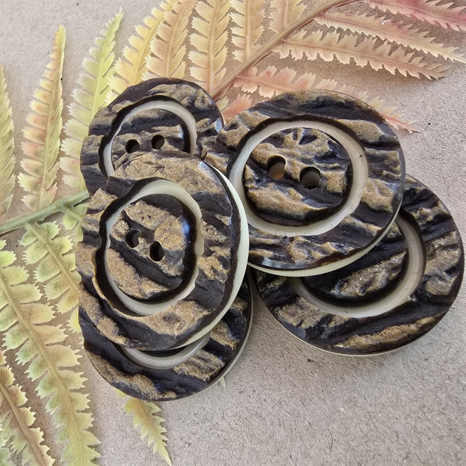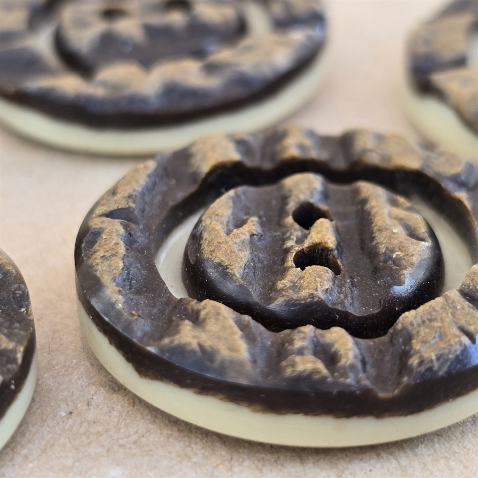 Dette sæt består af 5 smukt udformede knapper, som alle har en tiltalende offwhite og brun farve med indviklede trædekorationer.