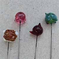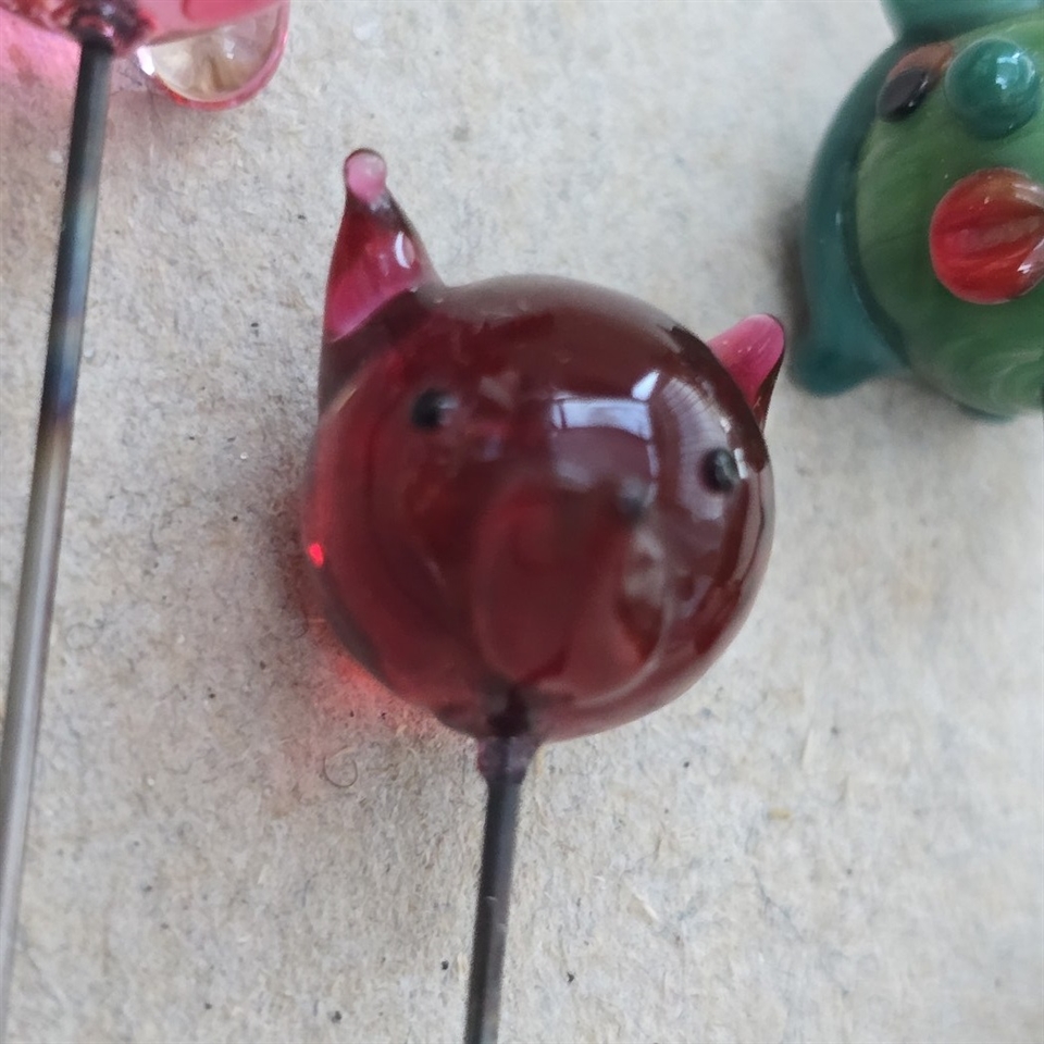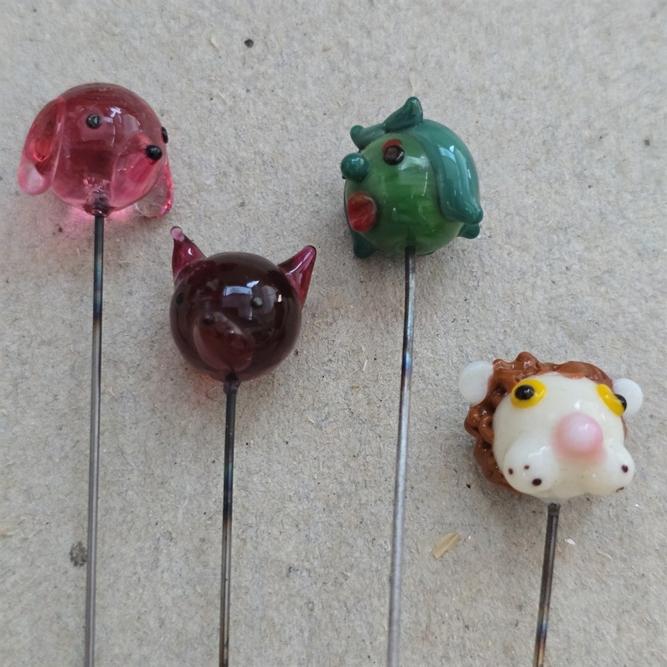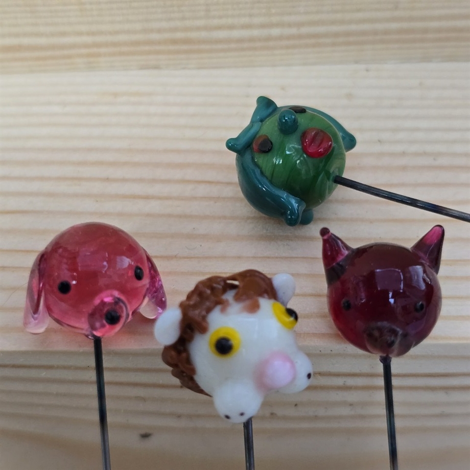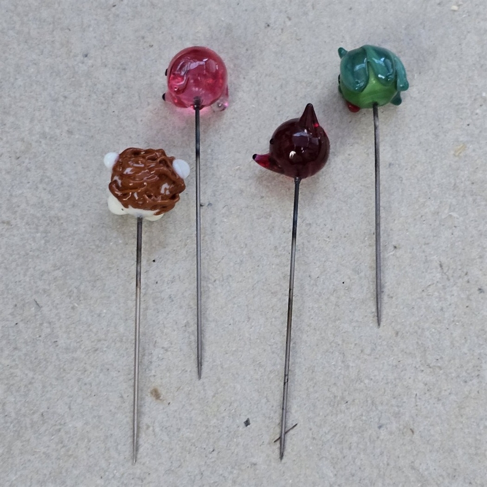 Den detaljerede fremstilling og de levende farver gør hver enkelt figur til noget helt specielt, og de gamle glas nipsenåle tilføjer et strejf af vintage æstetik til enhver indretning.