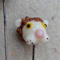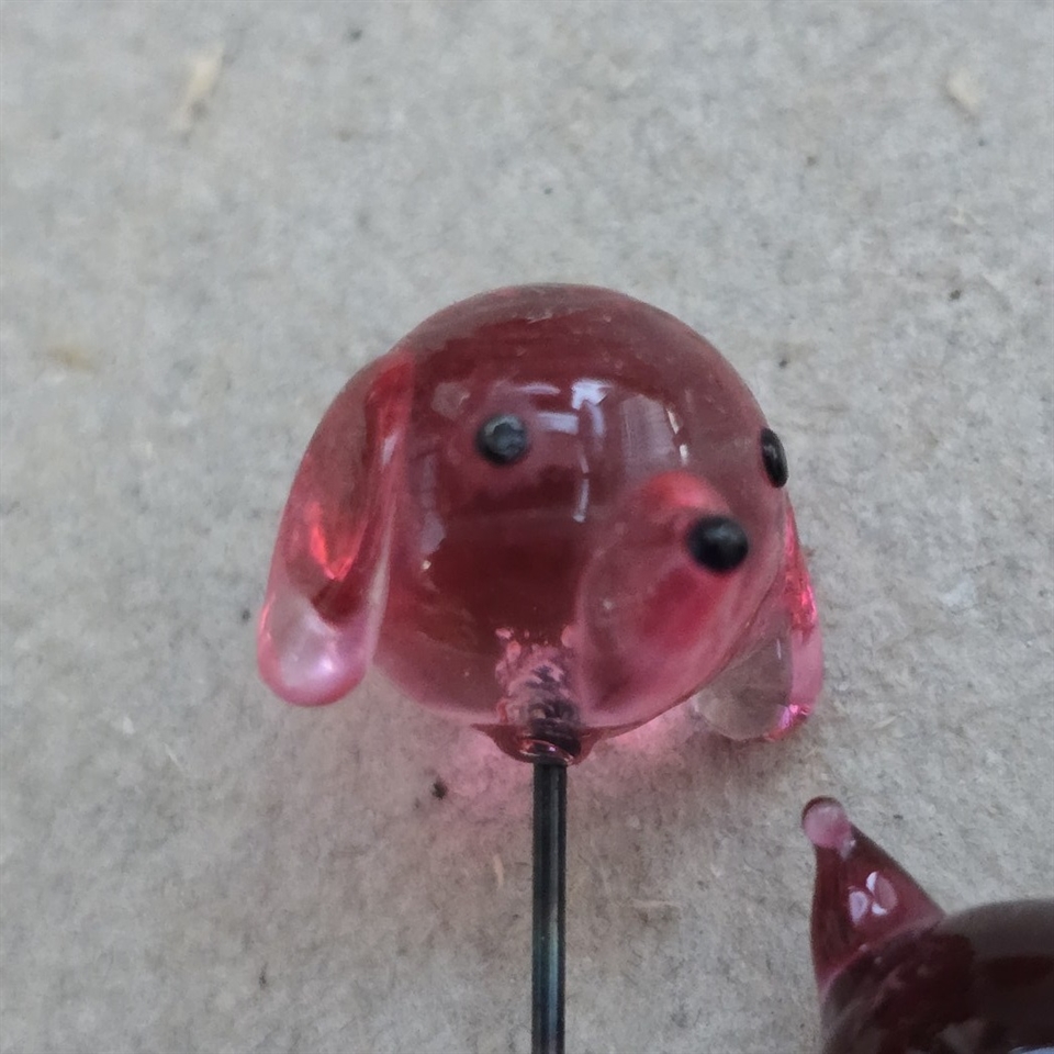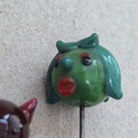 Dette sæt, kaldet "Tre dyrehoveder, grønt pigehoved, gamle glas nipsenåle," indeholder fire håndlavet figurer: et rødt hundehoved, et bordeaux kattehoved, et grønt pigehoved med en elegant sløjfe i håret, samt et hvidt fantasi hoved nipsenål, der alle er fremstillet af farvet glas.