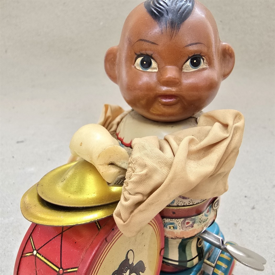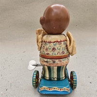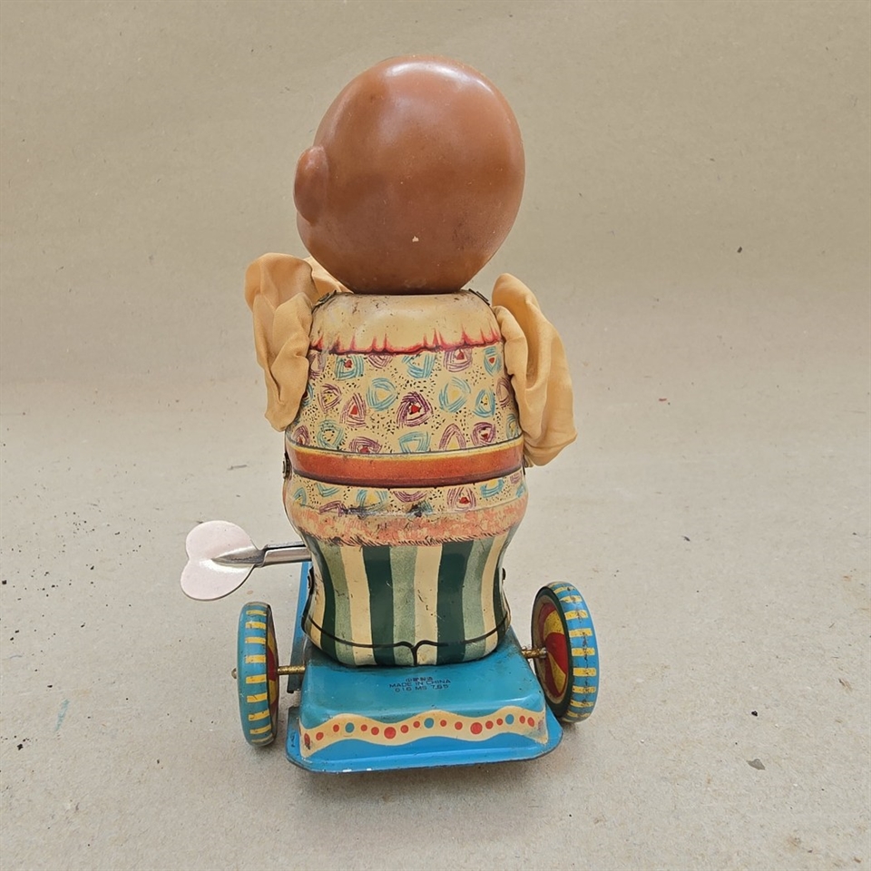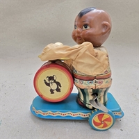 Oplev magien fra en svunden tid med "Trommedreng på hjul, mekanisk til optræk. Kinesisk." Dette charmerende stykke legetøj er en trofast gengivelse af historisk kunsthåndværk, der vil tilføre et strejf af nostalgi og glæde til ethvert hjem.