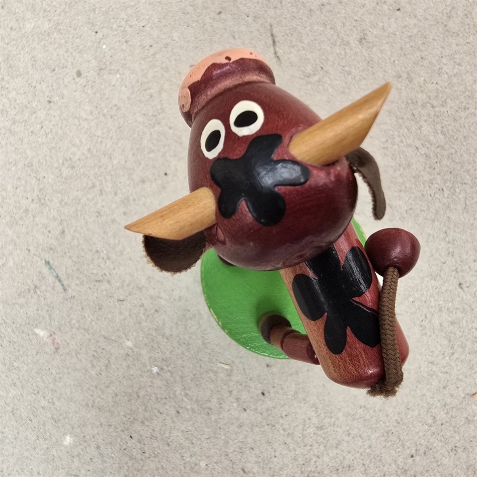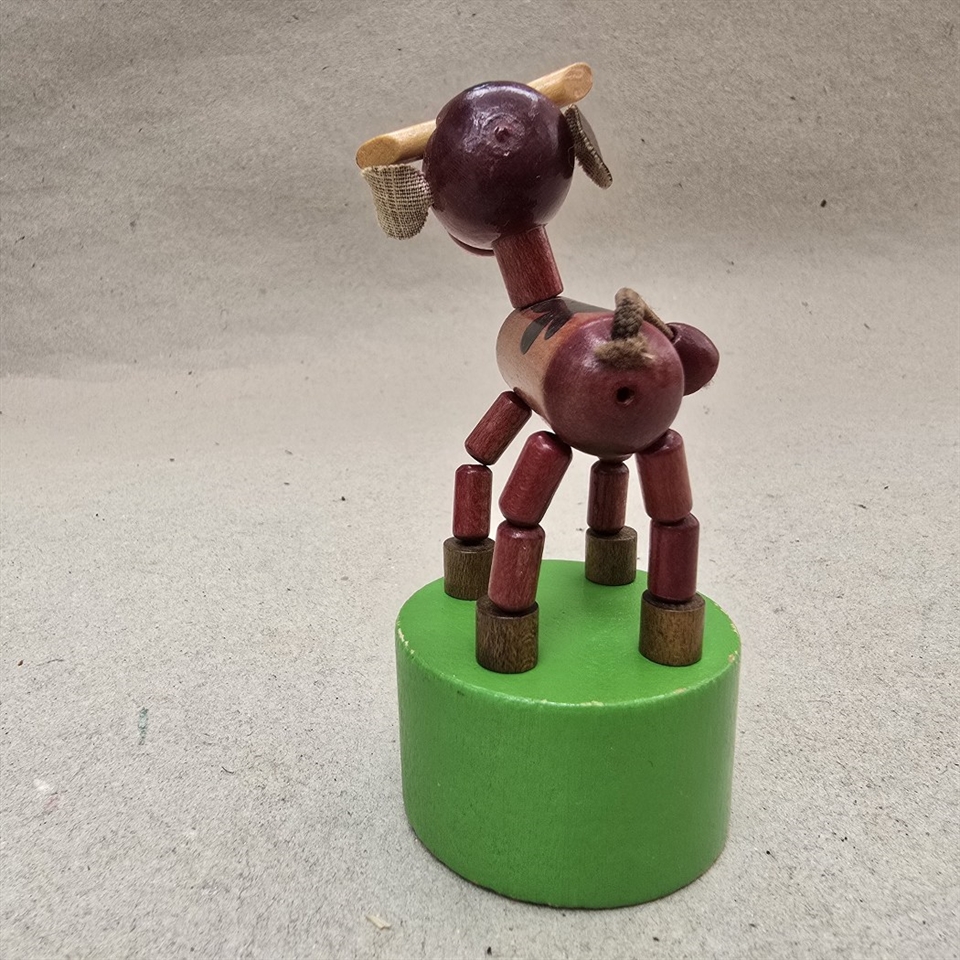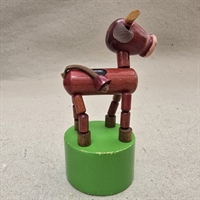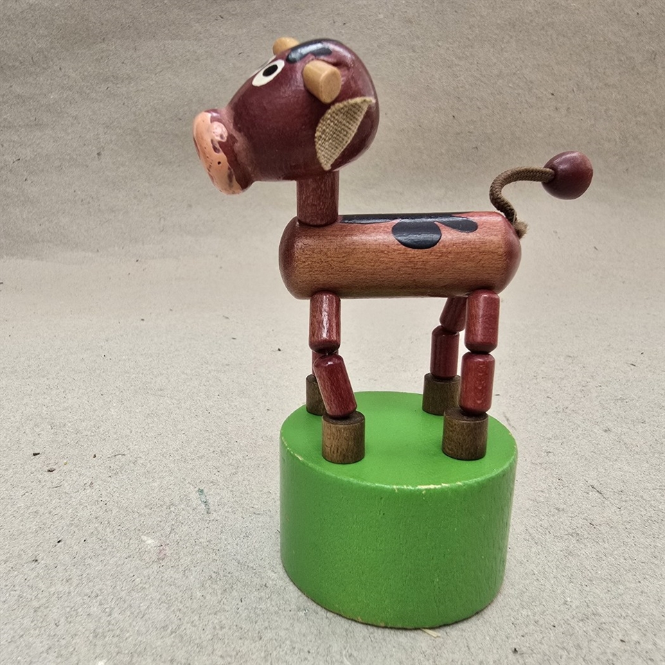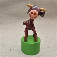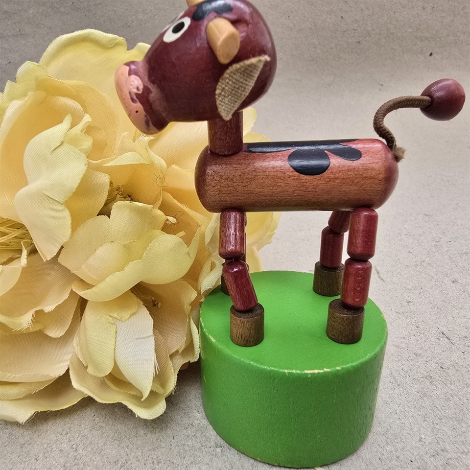 Oplev den charmerende og underholdende 'Trykdyr ko', der kollapser med et tryk! Denne søde ko, fremstillet af brun træ med sorte aftegninger, står stolt på en grøn trykknap.