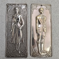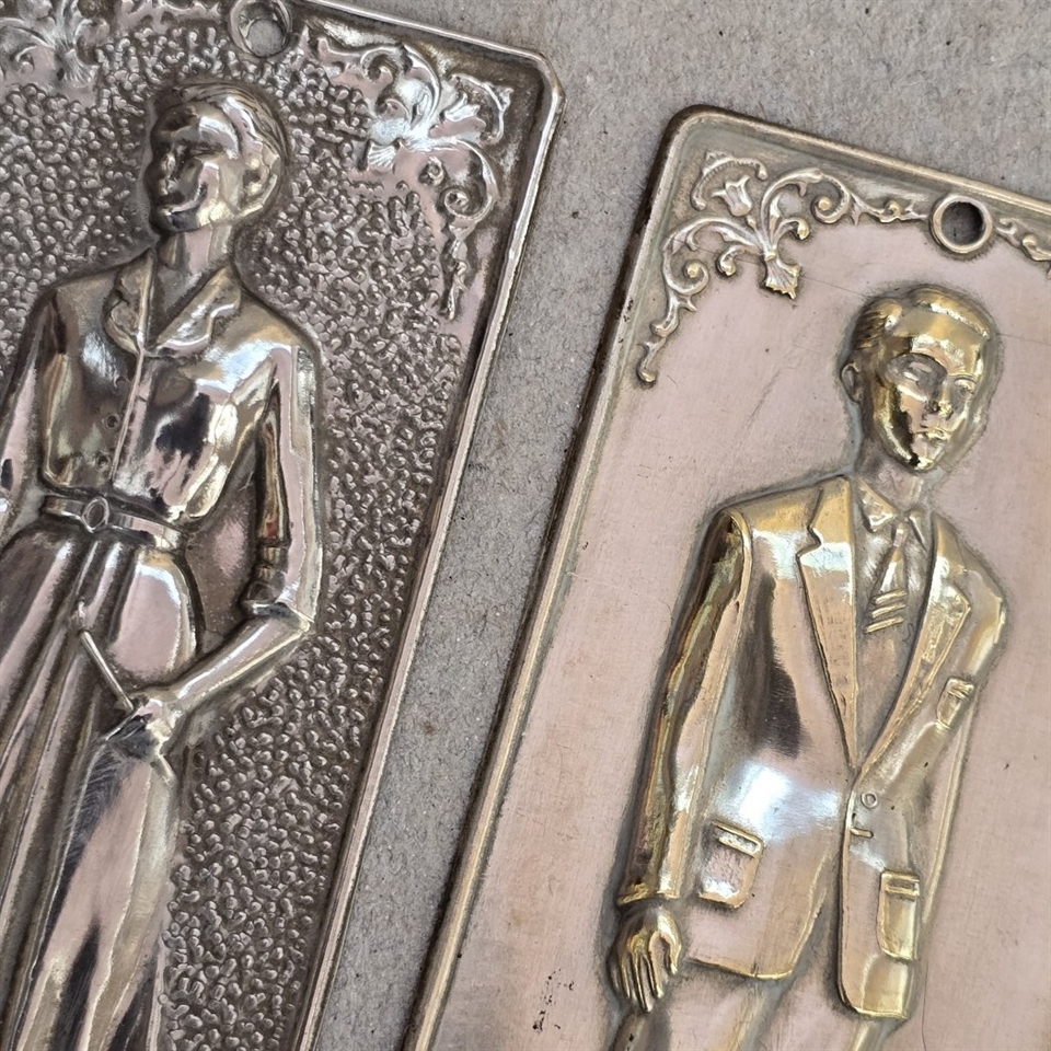 Disse unikke, sølvfarvede plader er præget med fine detaljer, der fremstiller en elegant dame og en distingveret herre, hvilket giver et nostalgisk pift til enhver indretning.