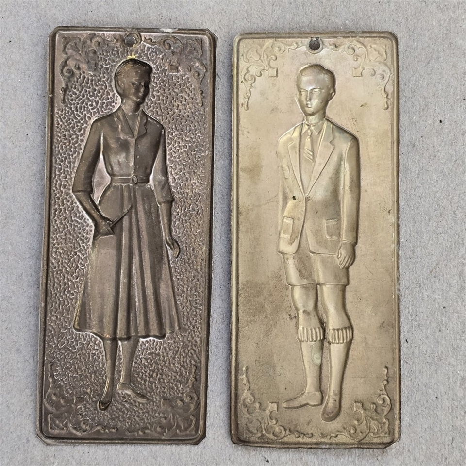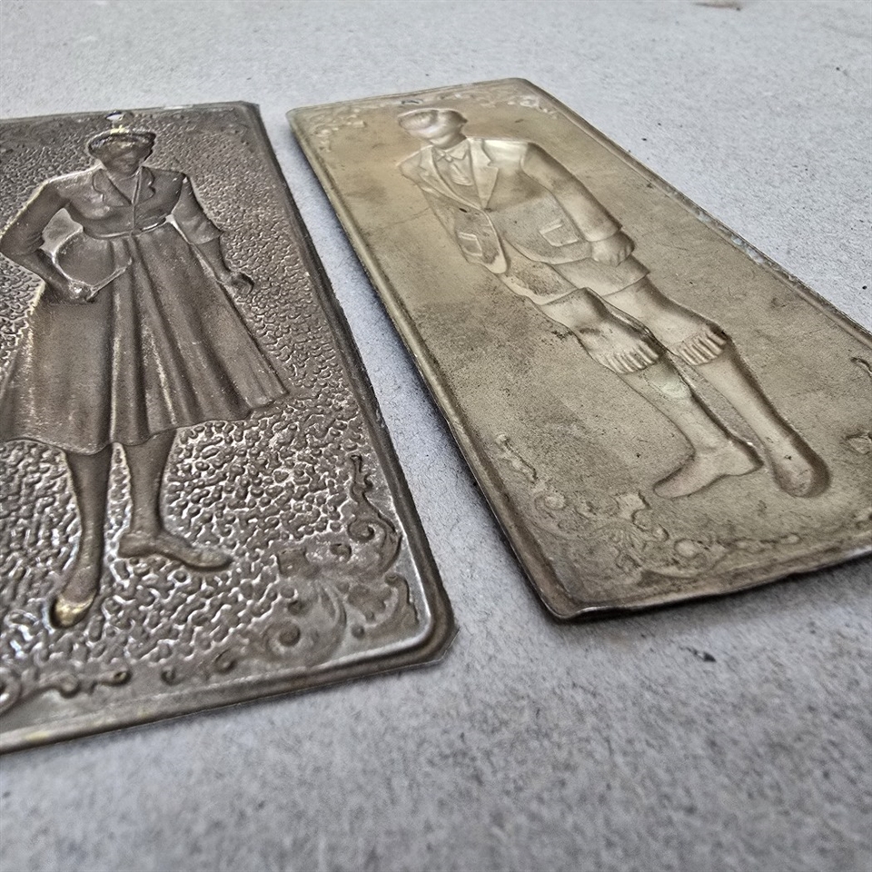Opdag charmen i historien med vores sæt af to 'Tynde gamle metalplader med dame og mand på'.
