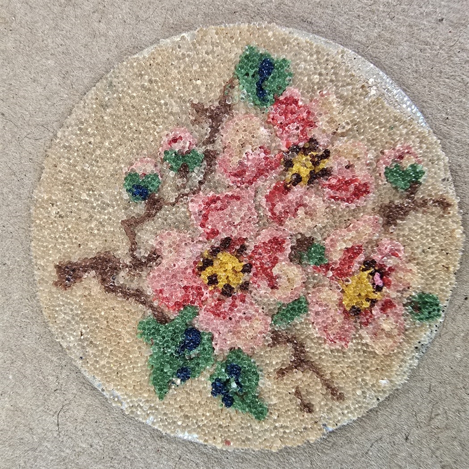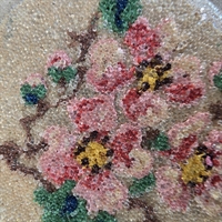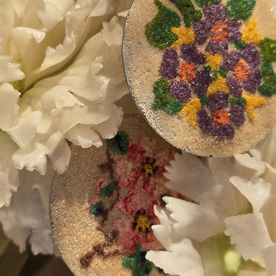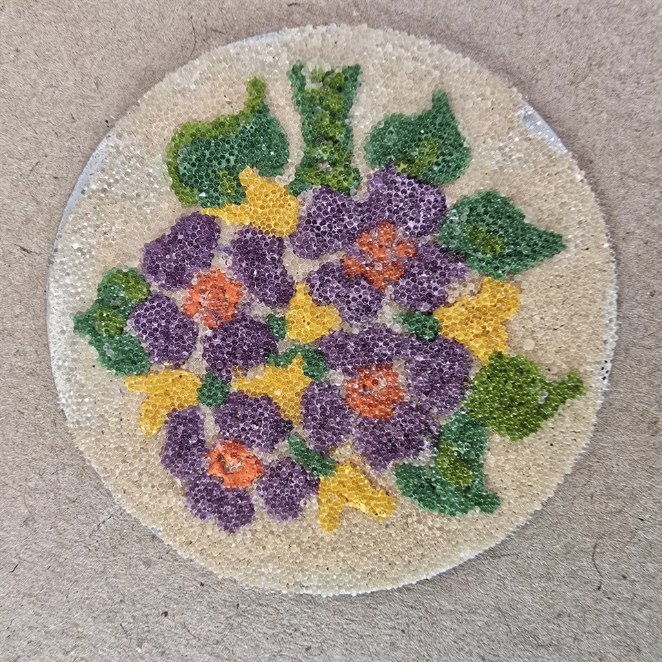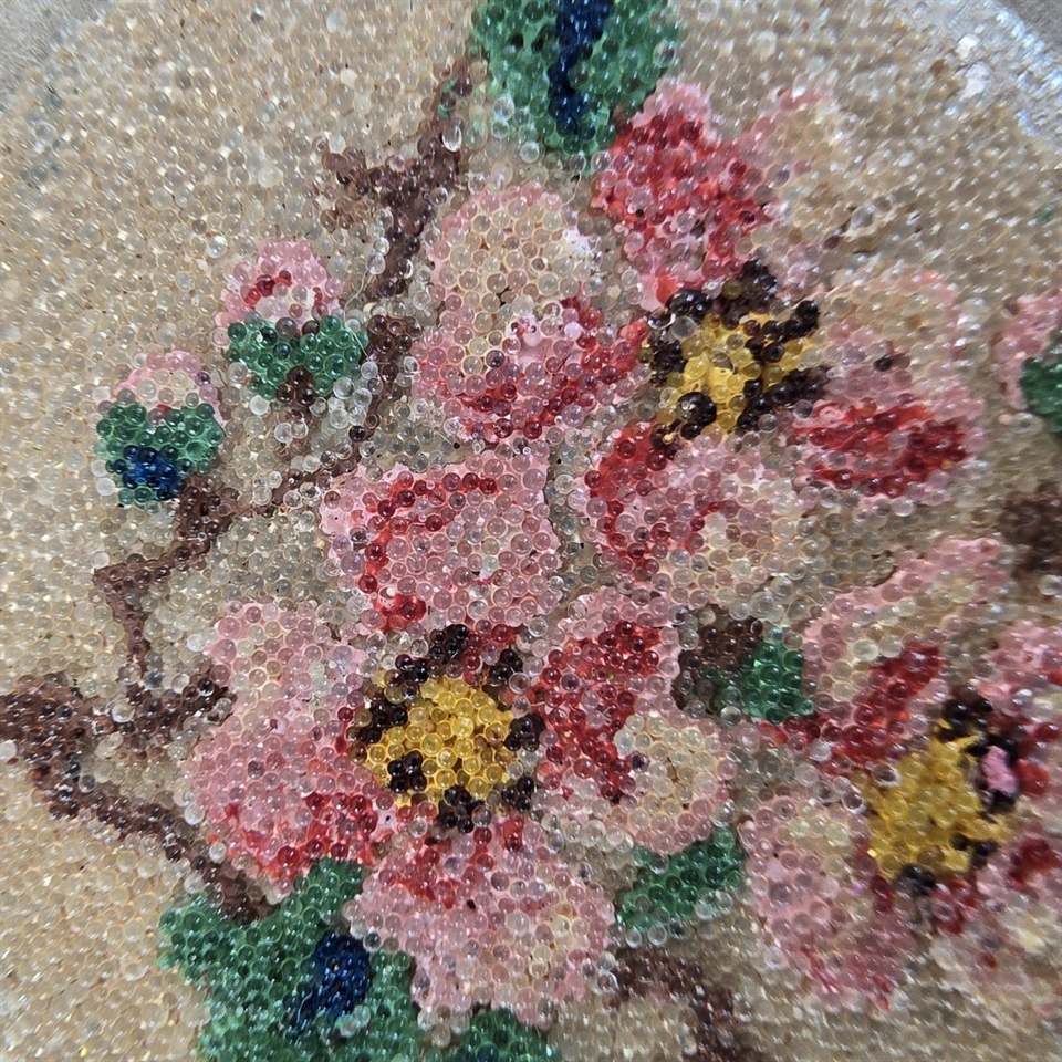 Opdag charmen og skønheden i håndværk med vores 'Ubrændt emaljearbejde, buketter i mini glaskugler på metalplade'. Dette sæt består af 2 unikke stykker, hver præsenterer en delikat blomsterbuket i mini glasperler.