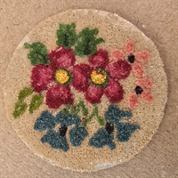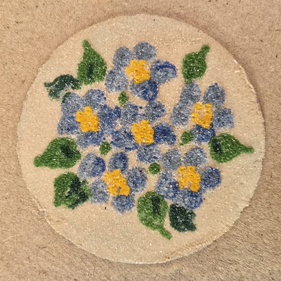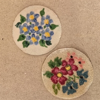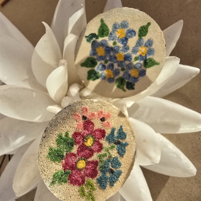 Pladerne er prydet med henholdsvis en blå og en multifarvet buket, udført i fine mini glasperler.