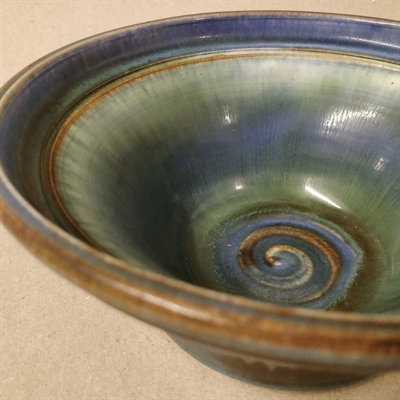 Smuk glaseret skål i grå, blå, grønne striber fra Sverige.