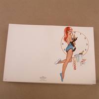 På postkortet ses kvinde med rødt hår, en stor urskive, en flaske champagne.