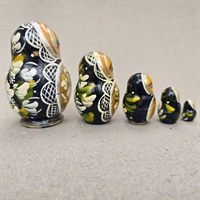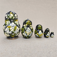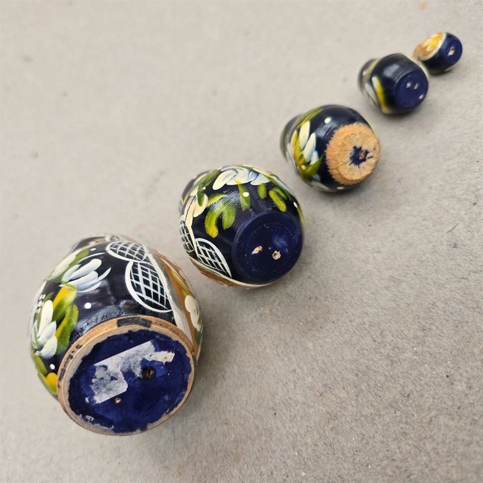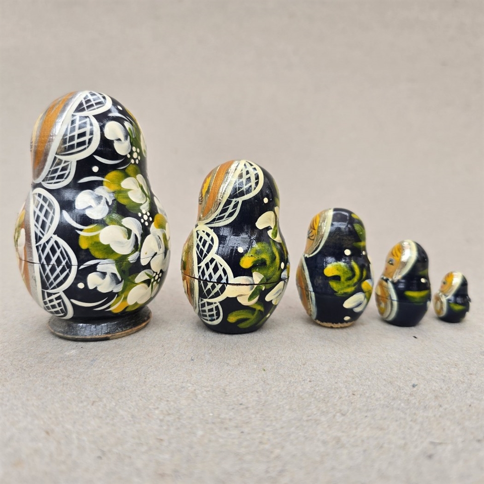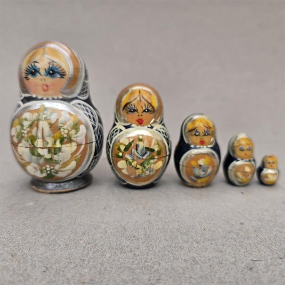 Sættet indeholder fem graduerende størrelser, hvor hver dukke kan åbnes for at afsløre den næste mindre dukke indeni.