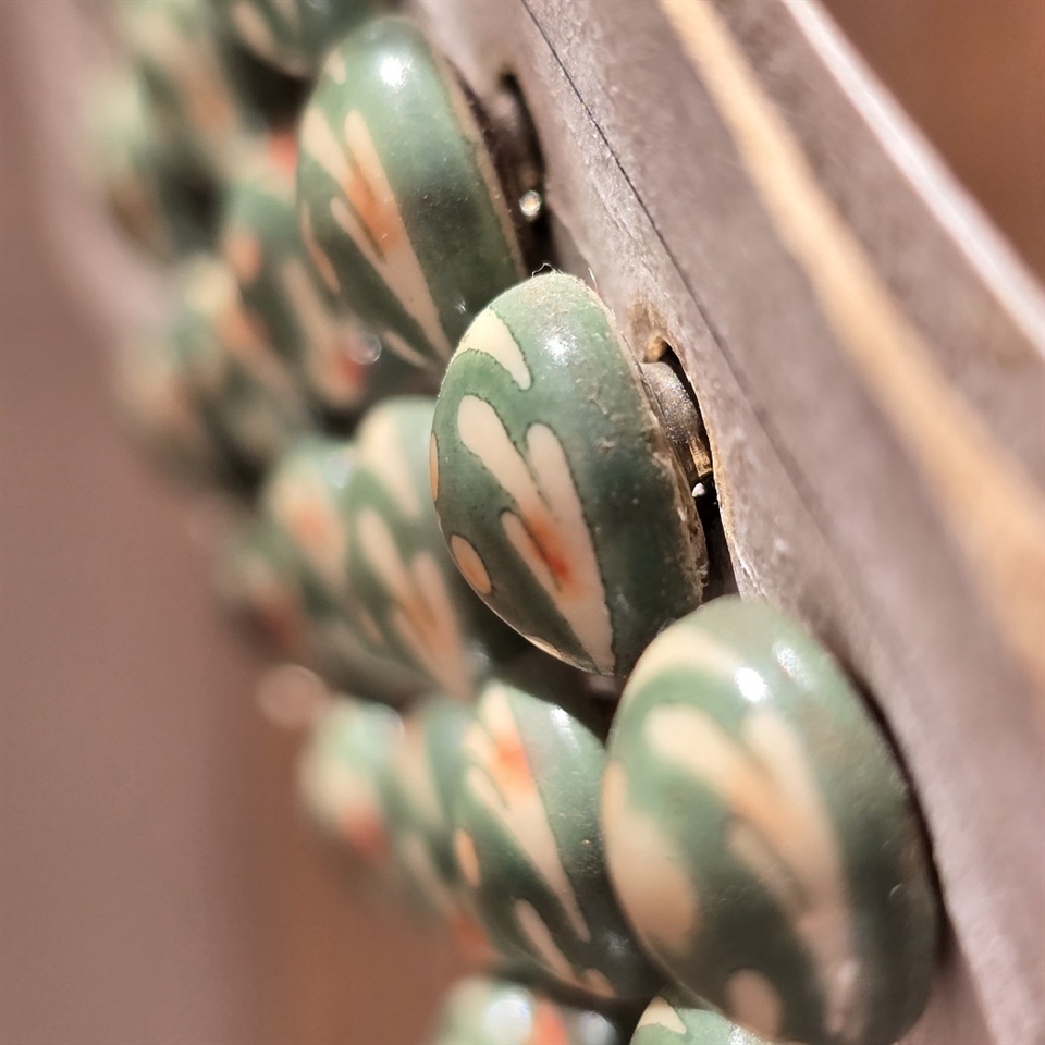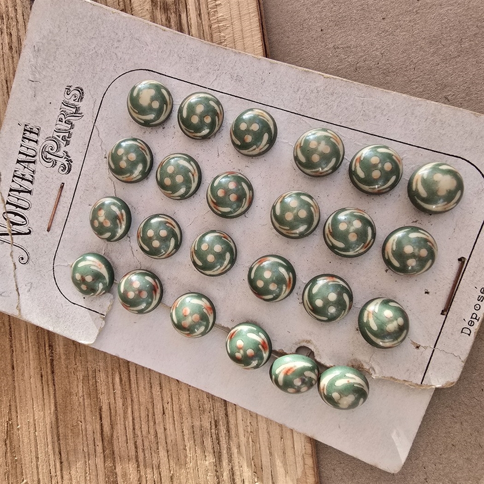 Disse yndige knapper i en frisk blanding af grøn, beige og rosa nuancer bringer et strejf af retro elegance til enhver beklædningsgenstand eller tilbehør.