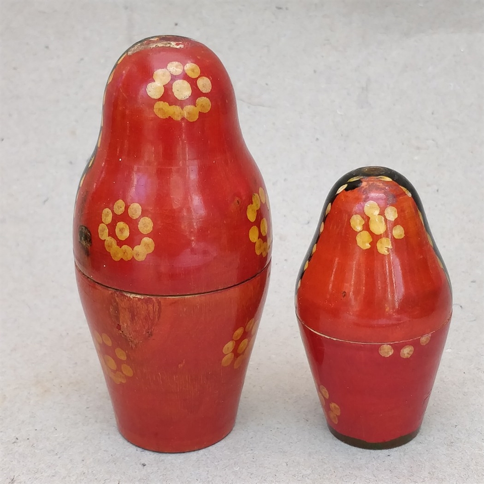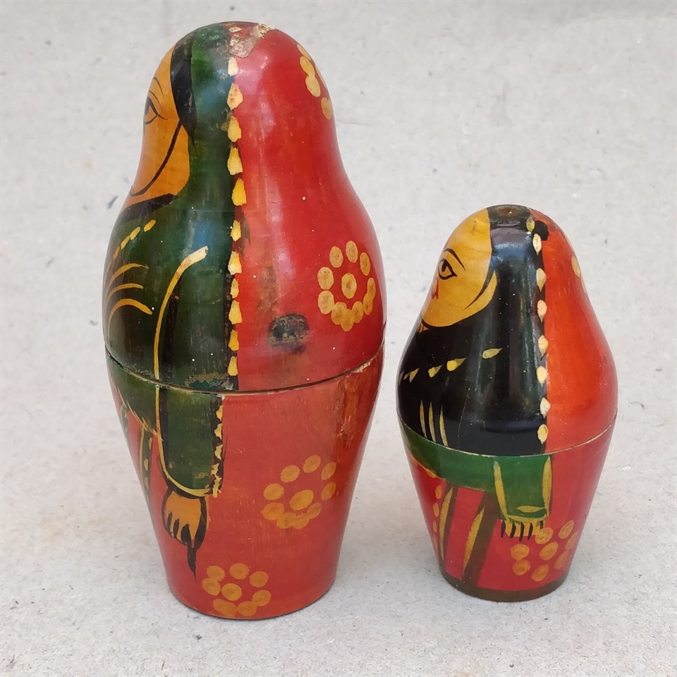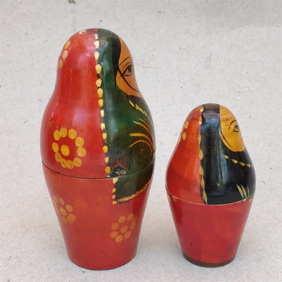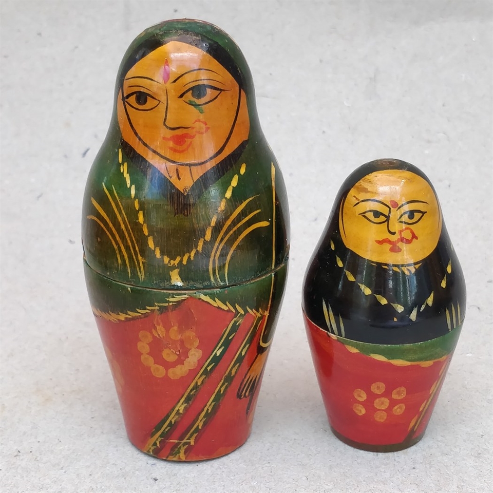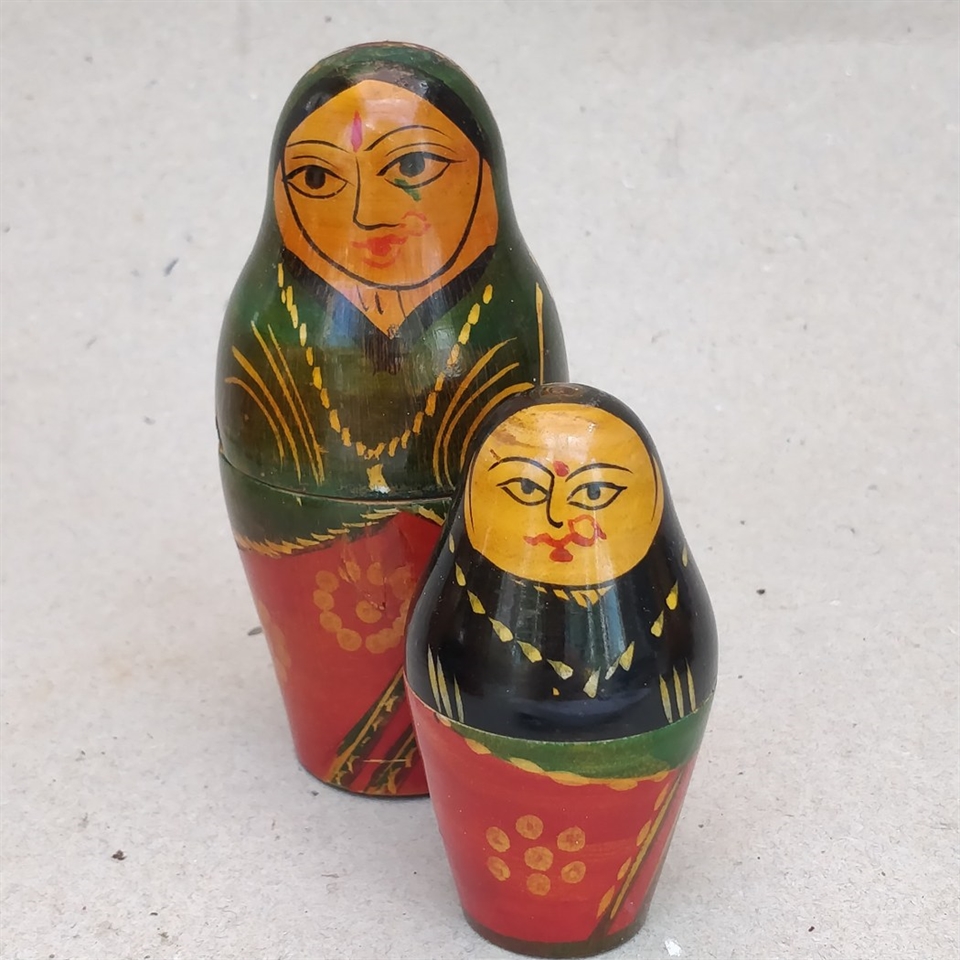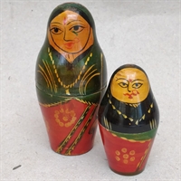 Dette sæt består af to unikt håndmalede dukker, der skiller sig ud med deres levende røde og grønne farvepalette og slanke design.