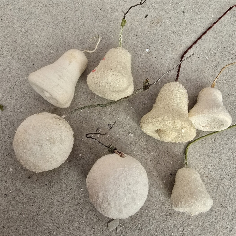 Gør dit juletræ unikt i år med dette særlige sæt af 'Vat klokke blandet lot sukker julepynt, gammelt. 7 dele'.