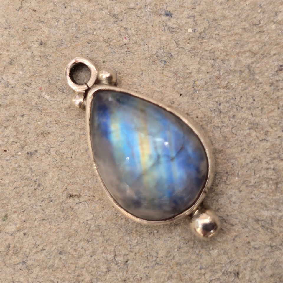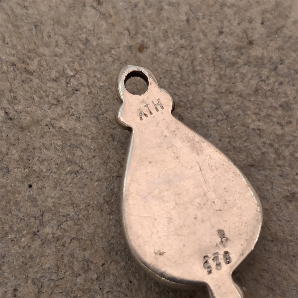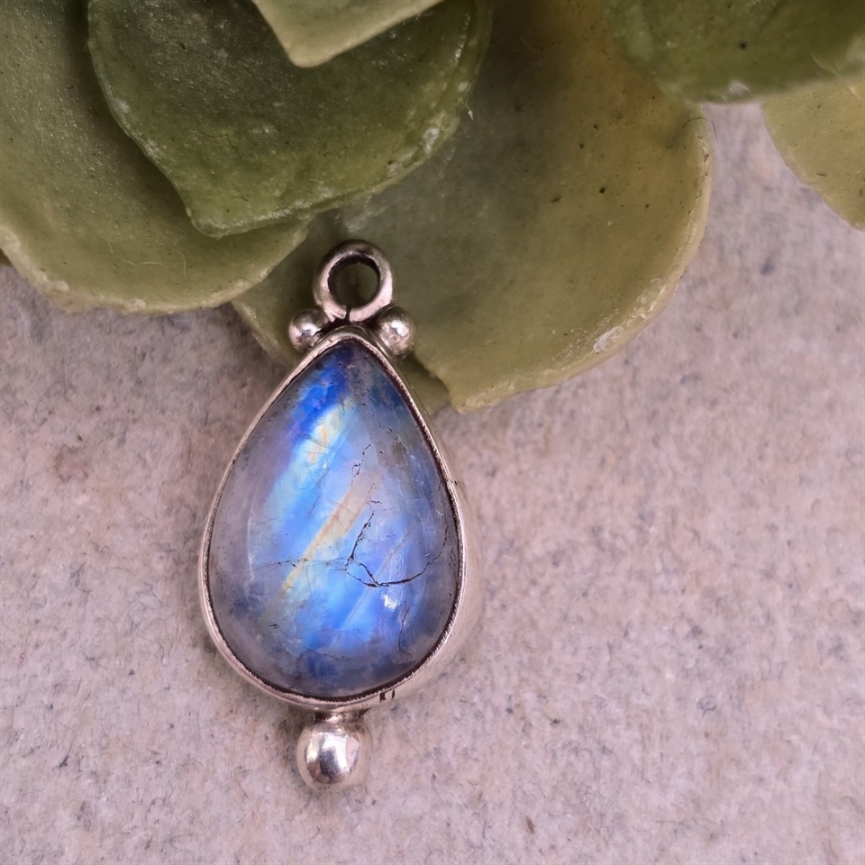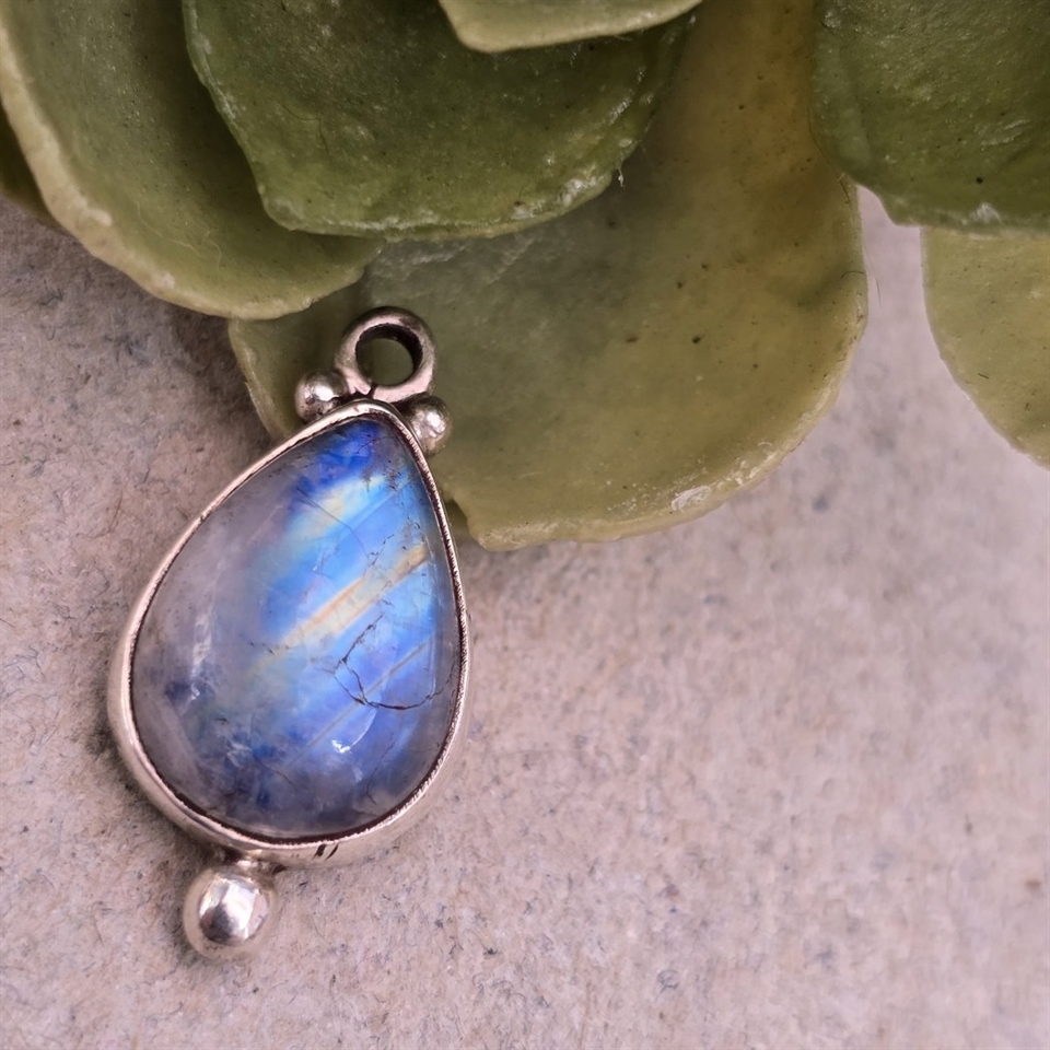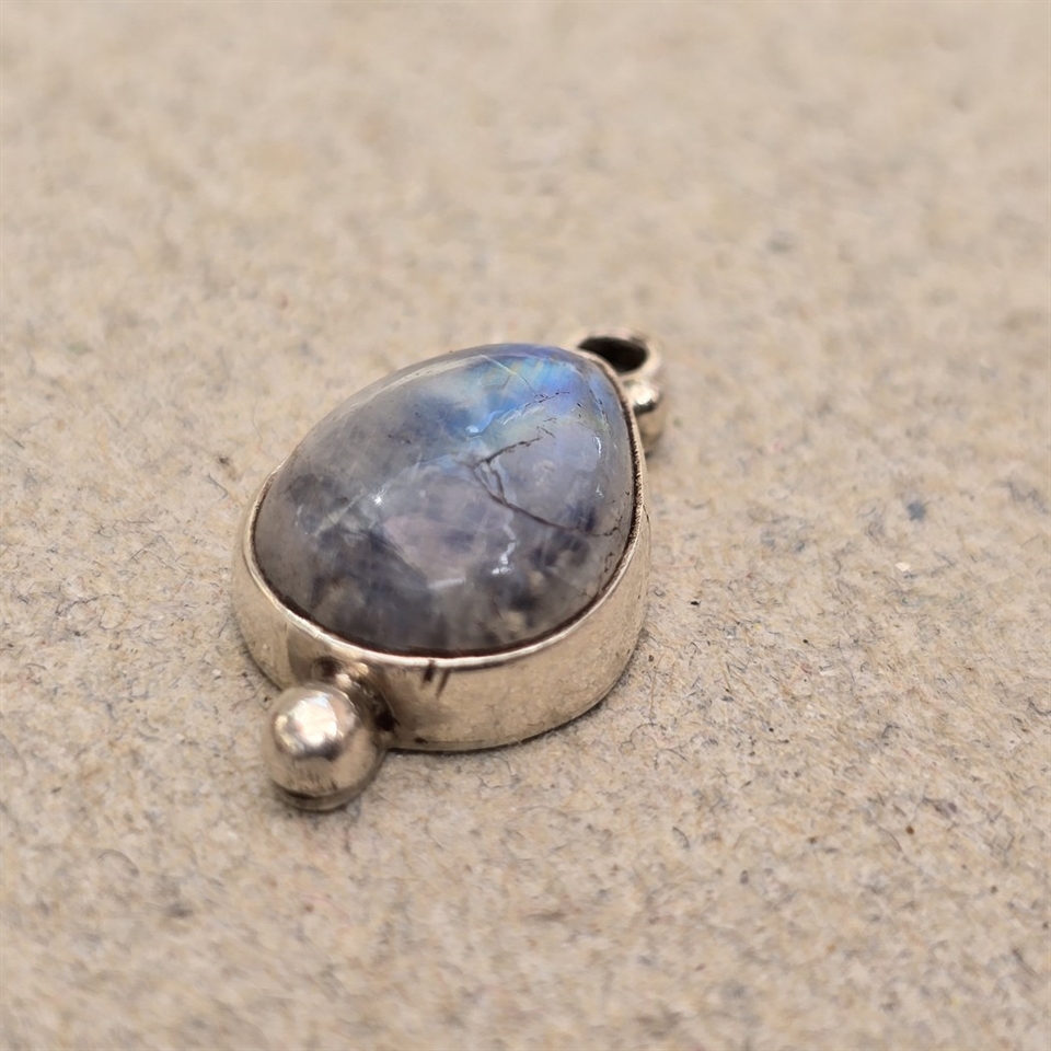 Vedhænget er omhyggeligt formet i en yndefuld dråbeform, der fremhæver den lyseblå stribede sten med en hypnotiserende dybde og skønhed. Stenen er mesterligt indfattet i lyst, skinnende 925 sølv, der tilføjer et strejf af glamour og sofistikation. Denne fortryllende kombination er yderligere forstærket af en delikat kugledekoration, som tilfører et vintage touch og gør smykket unikt.