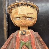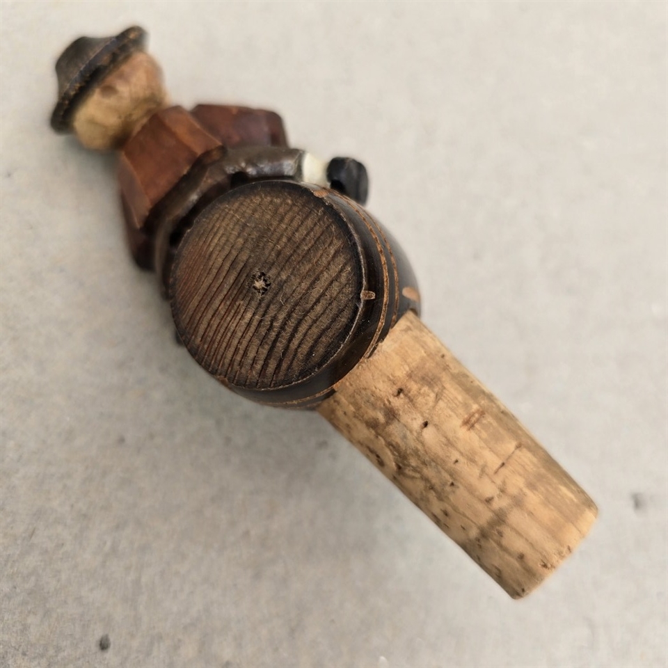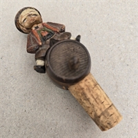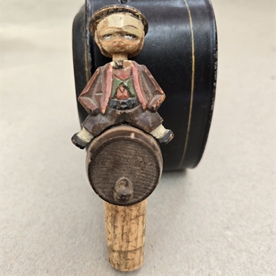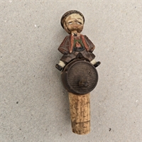 Forestil dig en lille dreng, der muntert sidder overskrævs på en gammeldags vintønde – alt sammen udført i smukt detaljeret træ. Denne vinprop er perfekt for enhver vinelsker eller samlere af unikke hjemmeartikler.