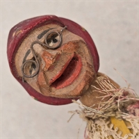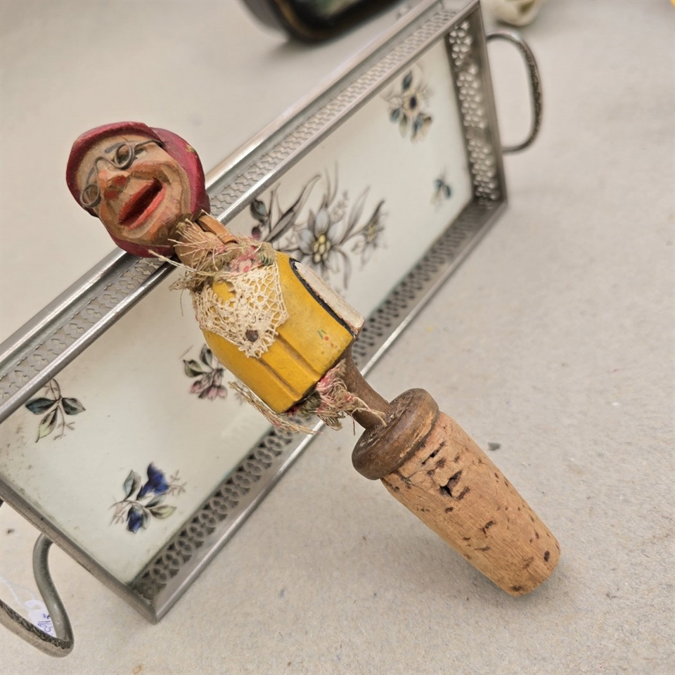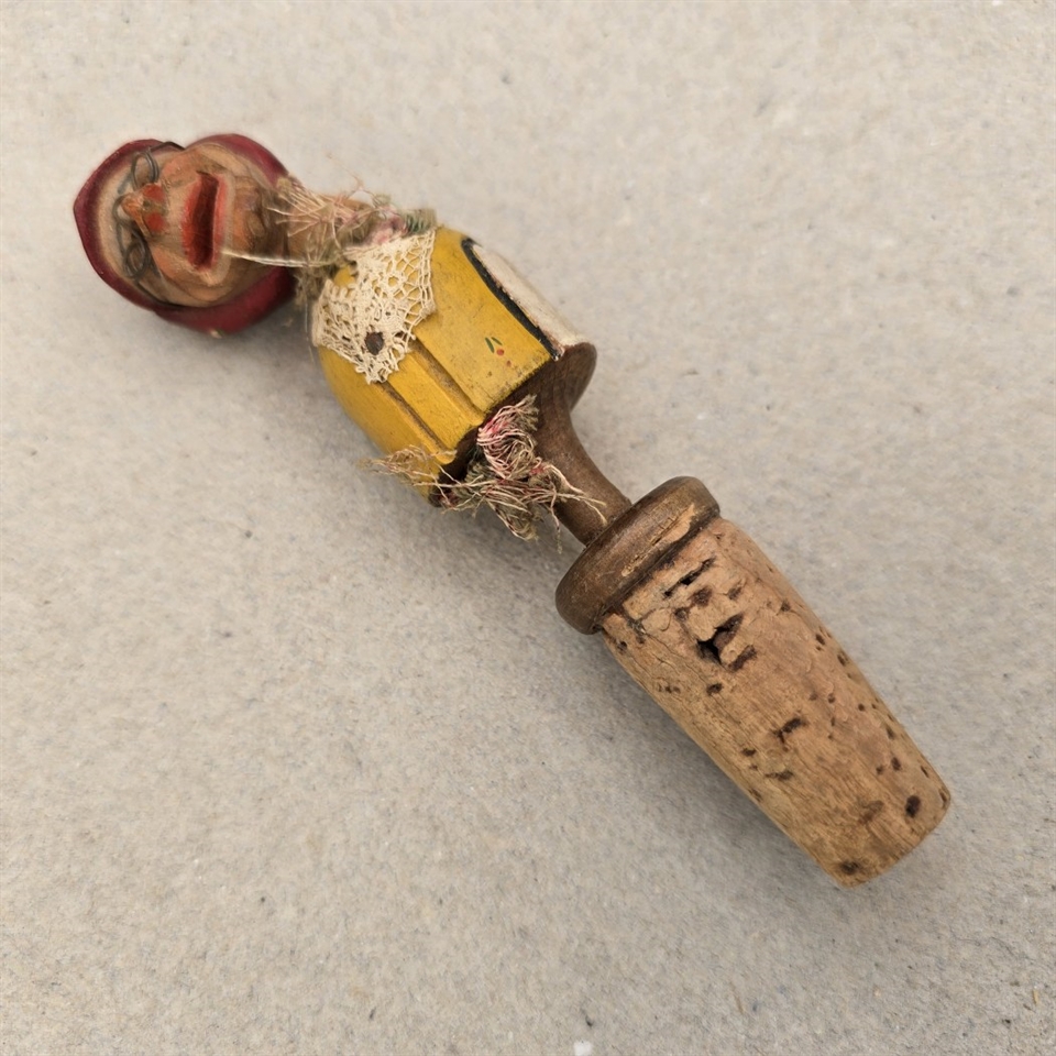 Opdag charmen og personligheden i vores unikke 'Vinprop træudskåret dame med briller og tørklæde, gammel prop'!