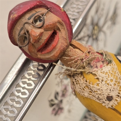 Forestil dig en lille træfigur, omhyggeligt udskåret med kærlighed og opmærksomhed på detaljerne. Vores dame er klædt i en livlig gul bluse og et iøjnefaldende rødt tørklæde, komplet med stilfulde sorte briller.