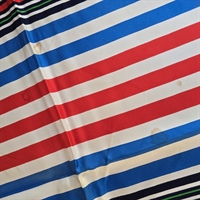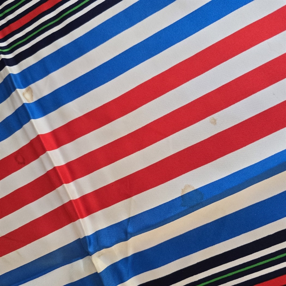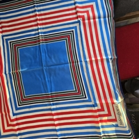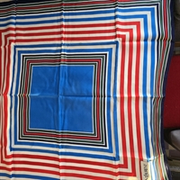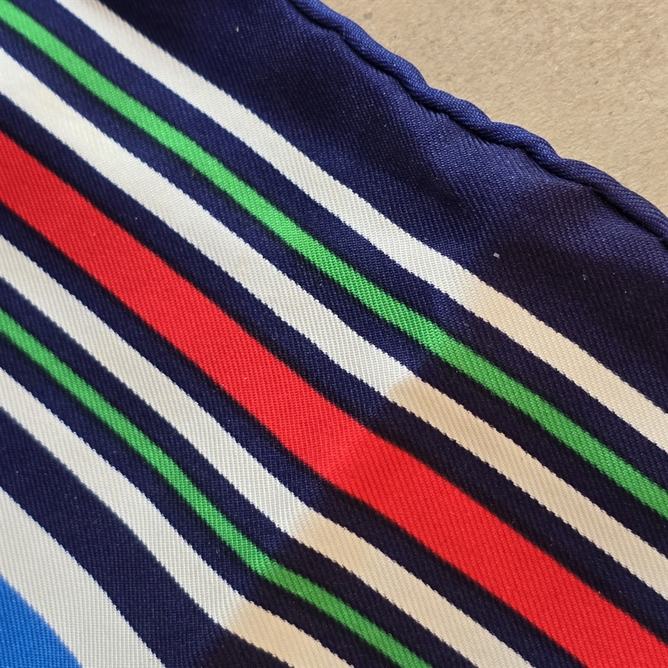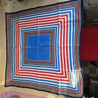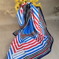 Tørklædet præsenterer et iøjnefaldende design med blå, røde og hvide striber, arrangeret i et klassisk kvadratisk mønster.