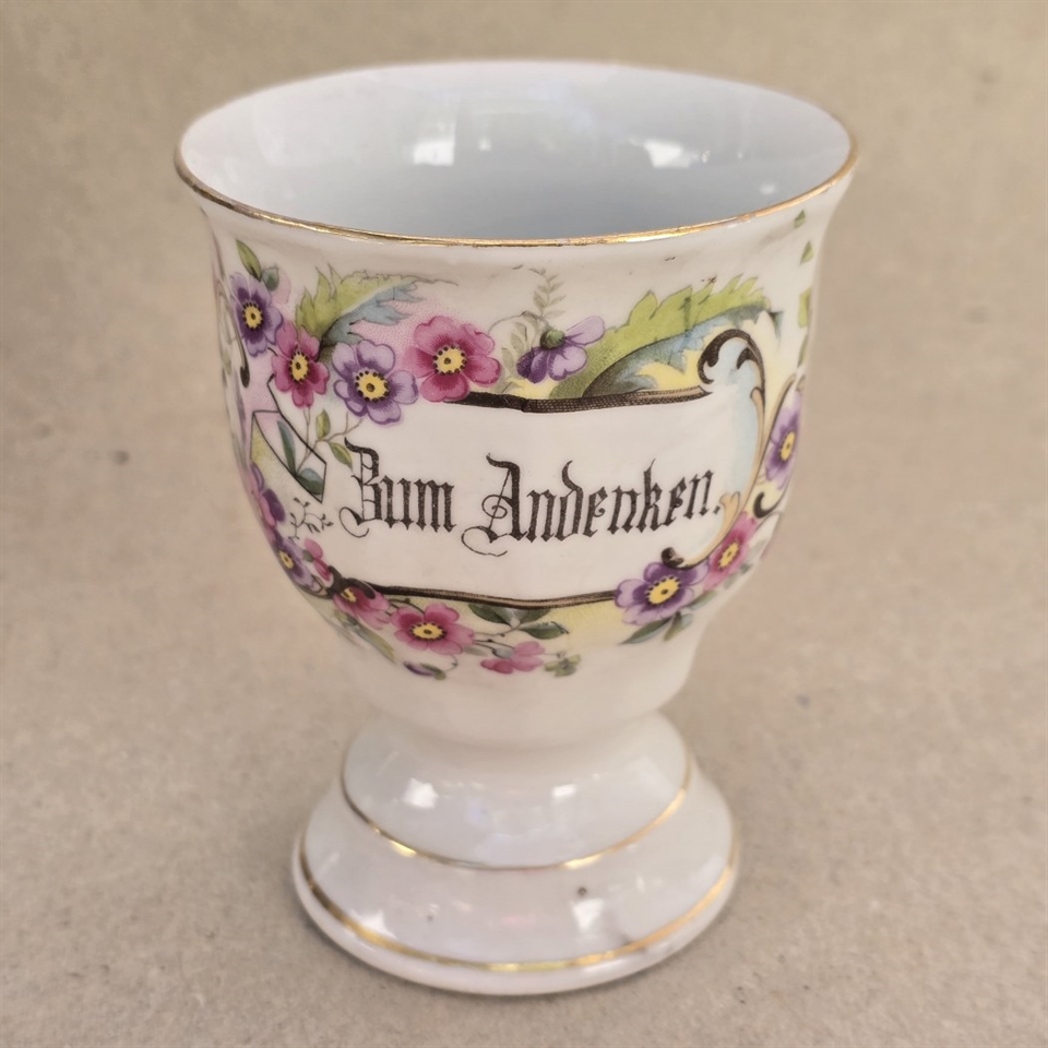 "Zum Andenken" betyder "til minde om", hvilket tilføjer et lag af sentimental værdi til dette allerede iøjnefaldende krus. Det er det perfekte valg for dem, der værdsætter vintage fund og ønsker at tilføje et strejf af gammeldags tysk æstetik til deres hjem.