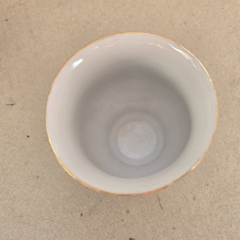 Oplev charmen fra fortiden med dette unikke tyske kakaokrus, "Zum andenken". Hver detalje i dette smukt blomsterdekorerede porcelænskrus fortæller en historie af nostalgi og tradition. Stående imponerende 11,3 cm. højt på sin elegante fod, er dette krus ikke kun en praktisk genstand, men også et kunstværk.